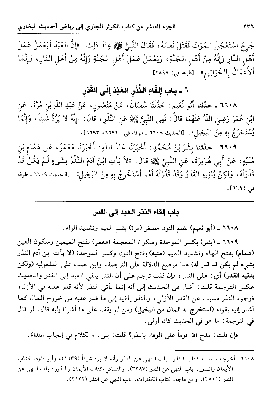 6609 - (بشر) بكسر الموحدة وسكون المعجمة (معمر) بفتح الميمين وسكون العين (همام) بفتح الهاء وتشديد الميم (منبه) بفتح النون وكسر الموحدة (لا يأت ابن آدم النذر بشيء لم يكن قد قدر له) هذا موضع الدلالة على الترجمة، وابن نصب على المفعولية (ولكن يلقيه القدر) أي: على النذر، فإن قلت ترجم على أن النذر يلقي العبد إلى القدر والحديث عكس الترجمة قلت: أشار في الحديث إلى أنه إنما يأتي النذر لأنه قدر عليه في الأزل، فوجود النذر مسبب عن القدر الأزلي، والنذر يلقيه إلى ما قدر عليه من خروج المال كما أشار إليه بقوله (استخرج به المال من البخيل) ومن لم يقف على ما أشرنا إليه قال: لو قال في الترجمة: ما هو في الحديث كان أولى.