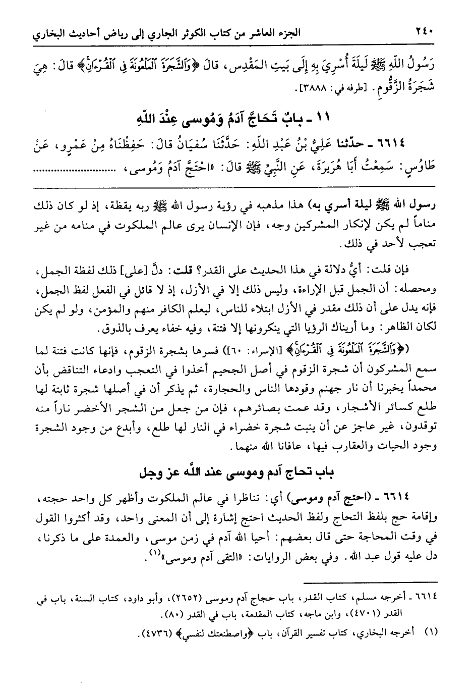 6614 - (احتج آدم وموسى) أي: تناظرا في عالم الملكوت وأظهر كل واحد حجته، وإقامة حج بلفظ التحاج ولفظ الحديث احتج إشارة إلى أن المعنى واحد، وقد أكثروا القول في وقت المحاجة حتى قال بعضهم: أحيا الله آدم في زمن موسى، والعمدة على ما ذكرنا، دل عليه قول عبد الله. وفي بعض الروايات: "التقى آدم وموسى".