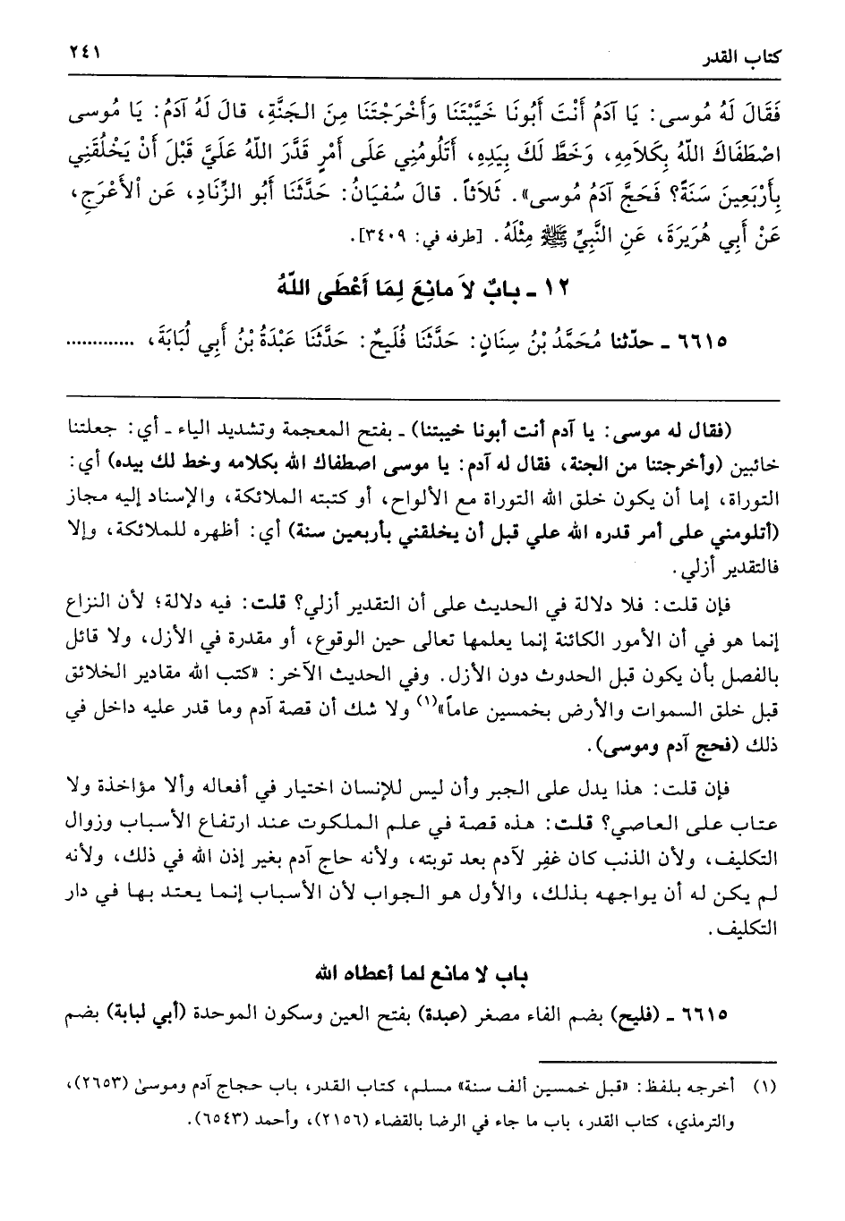 فإن قلت: فلا دلالة في الحديث على أن التقدير أزلي؟ قلت: فيه دلالة؛ لأن النزاع إنما هو في أن الأمور الكائنة إنما يعلمها تعالى حين الوقوع، أو مقدرة في الأزل، ولا قائل بالفصل بأن يكون قبل الحدوث دون الأزل. وفي الحديث الآخر: "كتب الله مقادير الخلائق قبل خلق السموات والأرض بخمسين عامًا" ولا شك أن قصة آدم وما قدر عليه داخل في ذلك (فحج آدم وموسى).