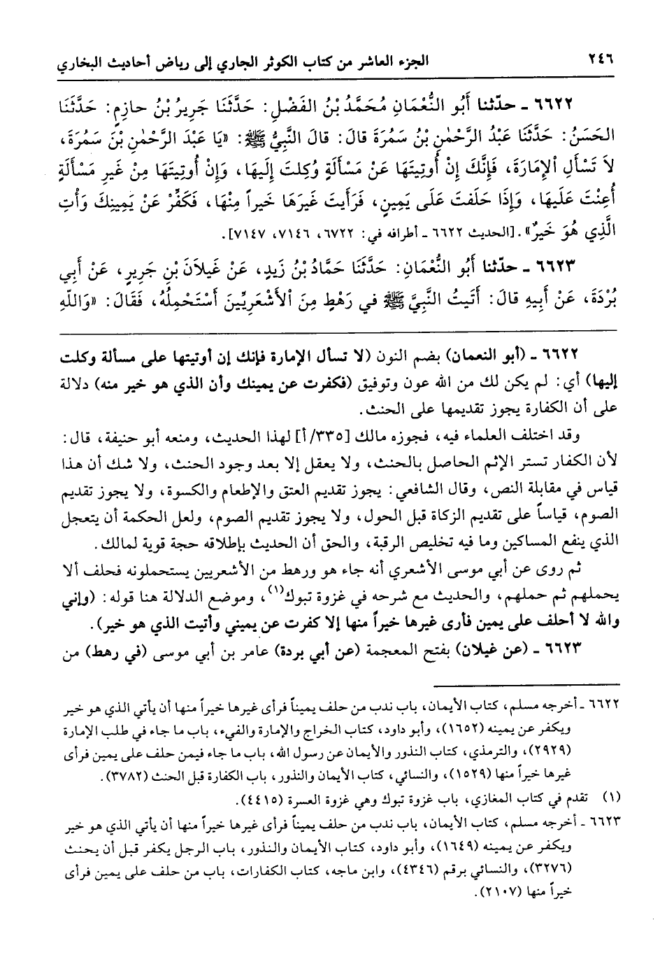 6622 - (أبو النعمان) بضم النون (لا تسأل الإمارة فإنك إن أوتيتها على مسألة وكلت إليها) أي: لم يكن لك من الله عون وتوفيق (فكفرت عن يمينك وأن الذي هو خير منه) دلالة على أن الكفارة يجوز تقديمها على الحنث.