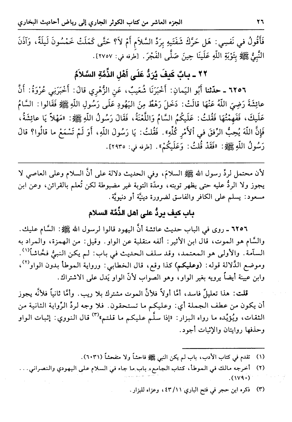 6256 - روى في الباب حديث عائشة أنَّ اليهود قالوا لرسول الله - صلى الله عليه وسلم -: السَّام عليك. والسَّام هو الموت، قال ابن الأثير: ألفه منقلبة عن الواو. وقيل: من الهمزة، والمراد به السآمة. والأولى هو المعتمد، وقد سلف الحديث في باب: لم يكن النبيُّ فحَّاشًا. وموضع الدَّلالة قوله: (وعليكم) كذا وقع، قال الخطابي: ورواية الموطأ بدون الواو، وابن عيينة أيضًا يرويه بغير الواو، وهو الصواب لأنّ الواو يَدل على الاشتراك.