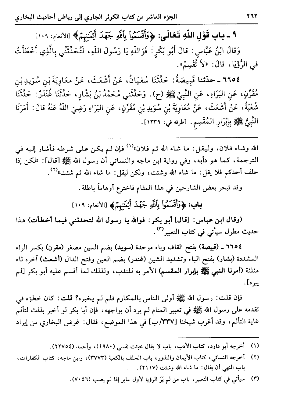 6654 - (قبيصة) بفتح القاف وباء موحدة (سويد) بضم السين مصغر (مقرن) بكسر الراء المشددة (بشار) بفتح الباء وتشديد الشين (غندر) بضم العين وفتح الدال (أشعث) آخره ثاء مثلثة (أمرنا النبي - صلى الله عليه وسلم - بإبرار المقسم) الأمر به للندب، ولذلك لما أقسم عليه أبو بكر [لم يبره].