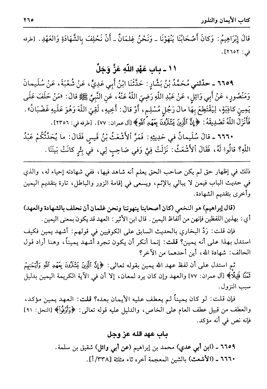 6659 - حَدَّثَنِى مُحَمَّدُ بْنُ بَشَّارٍ حَدَّثَنَا ابْنُ أَبِى عَدِىٍّ عَنْ شُعْبَةَ عَنْ سُلَيْمَانَ وَمَنْصُورٍ عَنْ أَبِى وَائِلٍ عَنْ عَبْدِ اللَّهِ - رضى الله عنه - عَنِ النَّبِيِّ - صلى الله عليه وسلم - قَالَ «مَنْ حَلَفَ عَلَى يَمِينٍ كَاذِبَةٍ، لِيَقْتَطِعَ بِهَا مَالَ رَجُلٍ مُسْلِمٍ أَوْ قَالَ أَخِيهِ لَقِىَ اللَّهَ وَهْوَ عَلَيْهِ غَضْبَانُ». فَأَنْزَلَ اللَّهُ تَصْدِيقَهُ (إِنَّ الَّذِينَ يَشْتَرُونَ بِعَهْدِ اللَّهِ). طرفه 2356