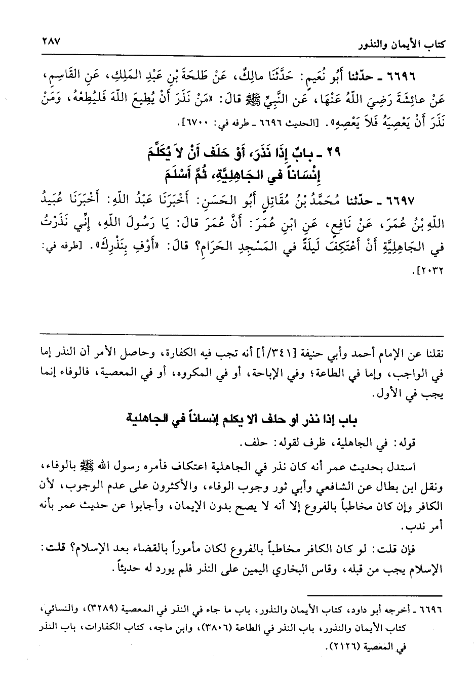 29 - باب إِذَا نَذَرَ أَوْ حَلَفَ أَنْ لاَ يُكَلِّمَ إِنْسَانًا فِي الْجَاهِلِيَّةِ ثُمَّ أَسْلَمَ