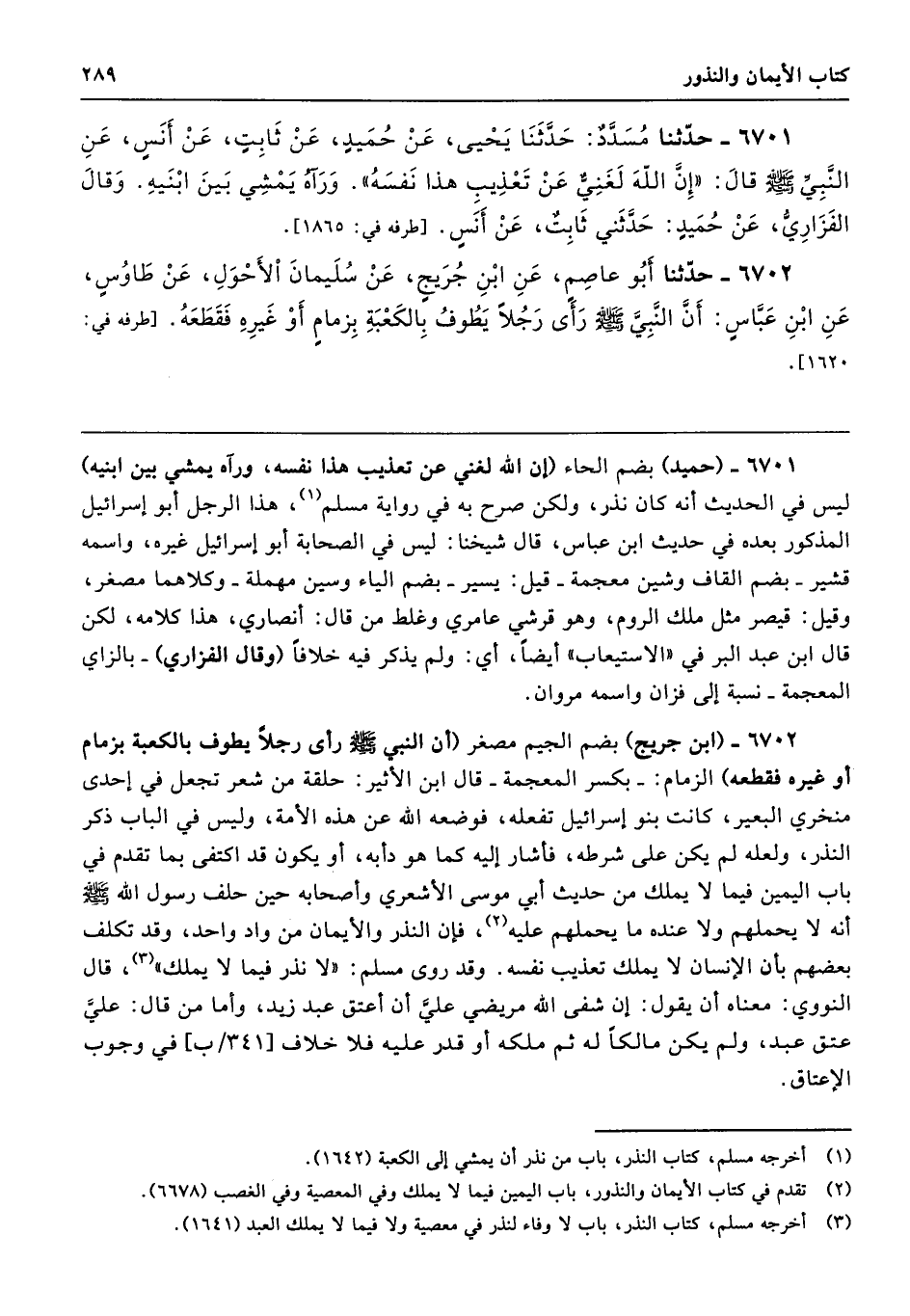 6702 - حَدَّثَنَا أَبُو عَاصِمٍ عَنِ ابْنِ جُرَيْجٍ عَنْ سُلَيْمَانَ الأَحْوَلِ عَنْ طَاوُسٍ عَنِ ابْنِ عَبَّاسٍ أَنَّ النَّبِىَّ - صلى الله عليه وسلم - رَأَى رَجُلاً يَطُوفُ بِالْكَعْبَةِ بِزِمَامٍ أَوْ غَيْرِهِ، فَقَطَعَهُ. طرفه 1620