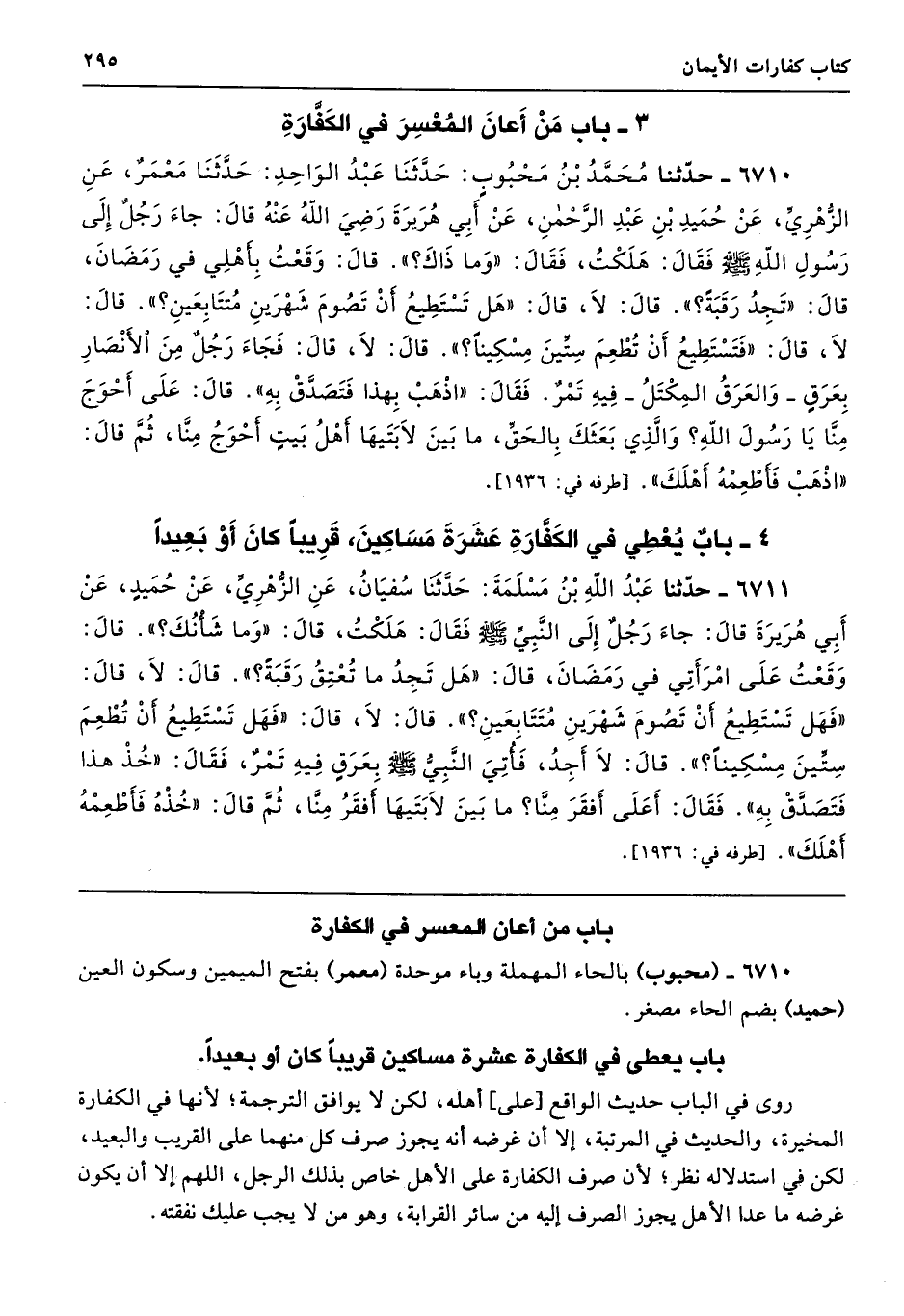 روى في الباب حديث الواقع [على] أهله، لكن لا يوافق الترجمة؛ لأنها في الكفارة المخيرة، والحديث في المرتبة، إلا أن غرضه أنه يجوز صرف كل منهما على القريب والبعيد، لكن في استدلاله نظر؛ لأن صرف الكفارة على الأهل خاص بذلك الرجل، اللهم إلا أن يكون غرضه ما عدا الأهل يجوز الصرف إليه من سائر القرابة، وهو من لا يجب عليك نفقته.