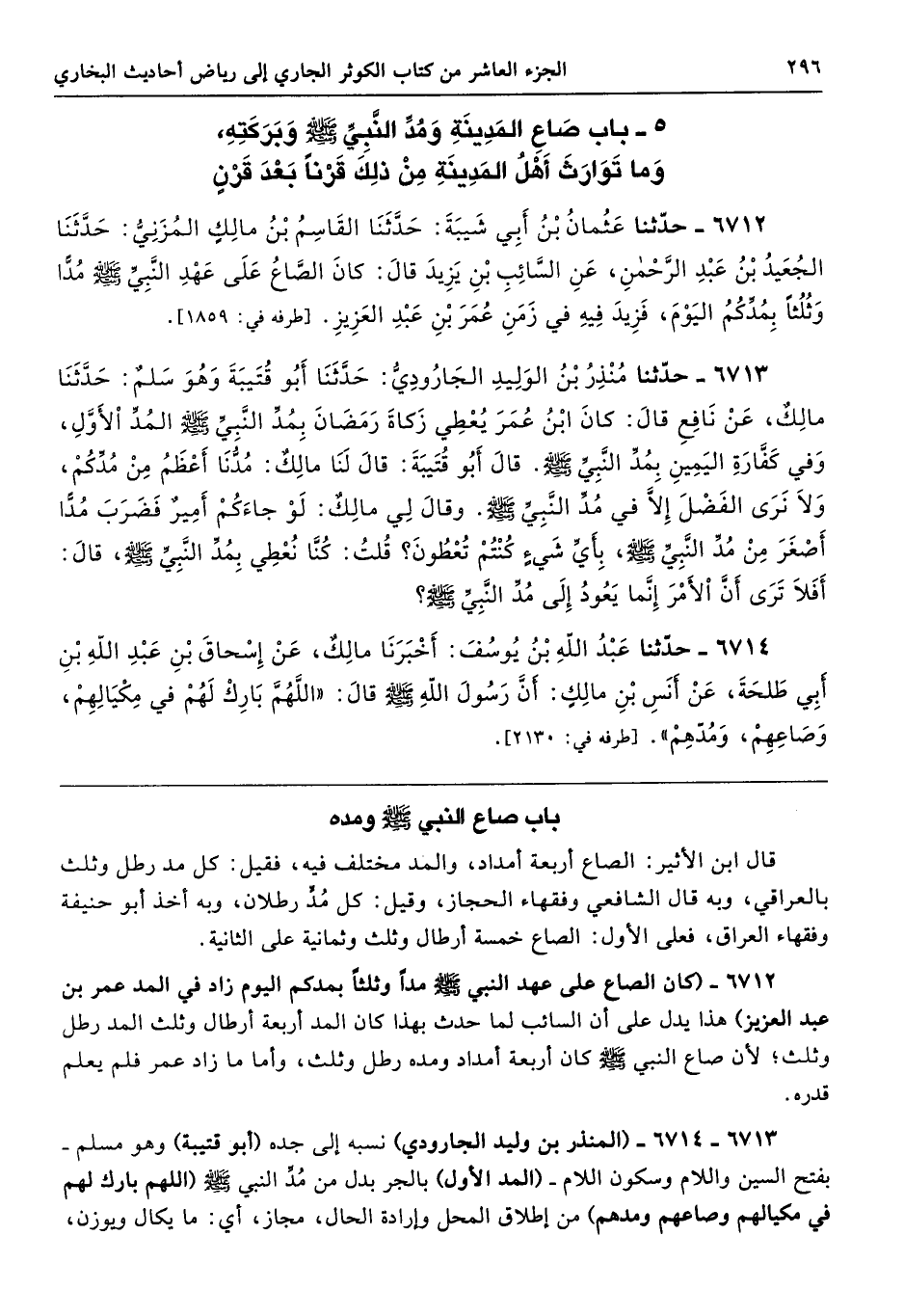 6713 - 6714 - (المنذر بن وليد الجارودي) نسبه إلى جده (أبو قتيبة) وهو مسلم -بفتح السين واللام وسكون اللام- (المد الأول) بالجر بدل من مُدِّ النبي - صلى الله عليه وسلم - (اللهم بارك لهم في مكيالهم وصاعهم ومدهم) من إطلاق المحل وإرادة الحال، مجاز، أي: ما يكال ويوزن،