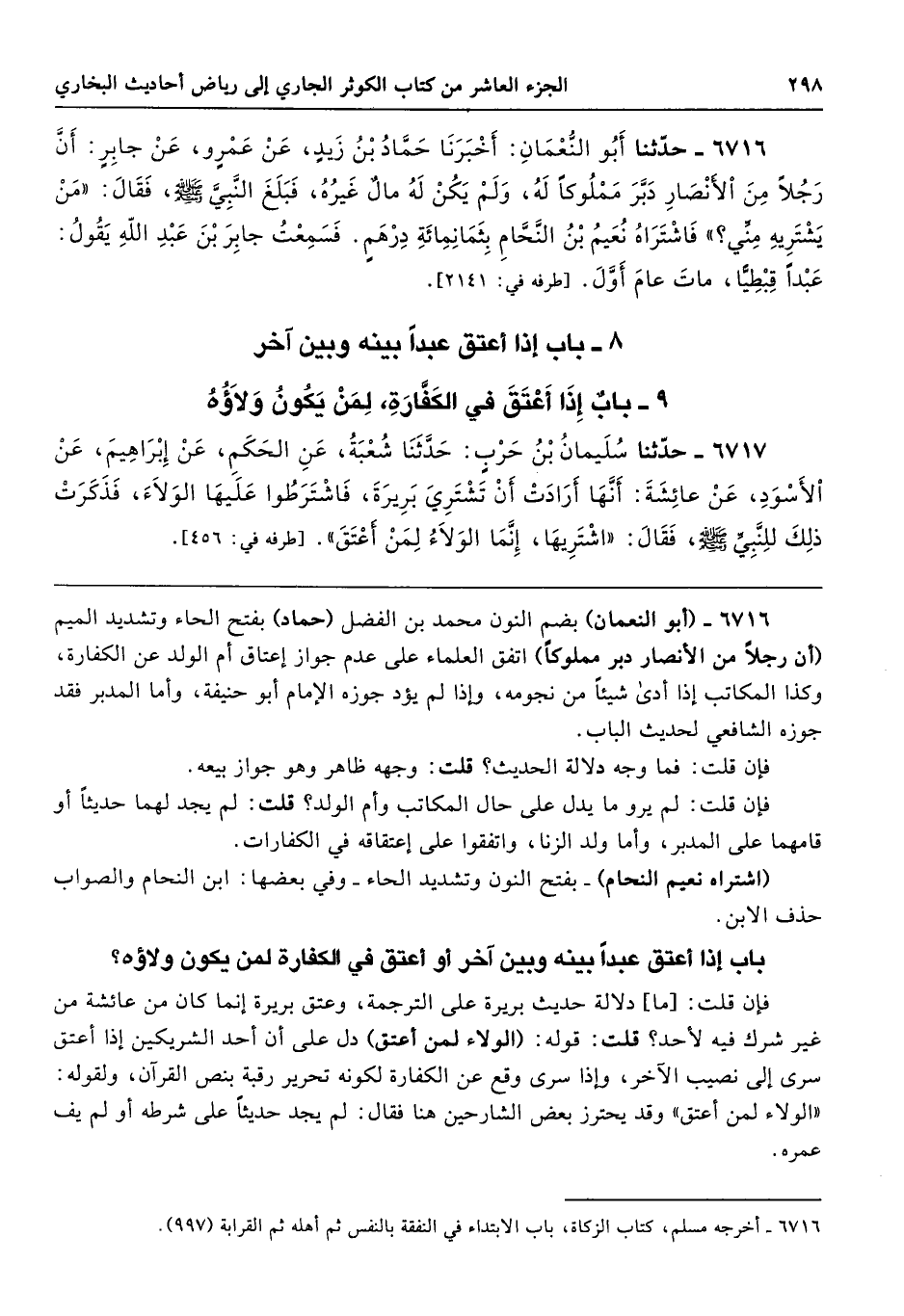 6716 - (أبو النعمان) بضم النون محمد بن الفضل (حماد) بفتح الحاء وتشديد الميم (أن رجلًا من الأنصار دبر مملوكًا) اتفق العلماء على عدم جواز إعتاق أم الولد عن الكفارة، وكذا المكاتب إذا أدى شيئًا من نجومه، وإذا لم يؤد جوزه الإمام أبو حنيفة، وأما المدبر فقد جوزه الشافعي لحديث الباب.