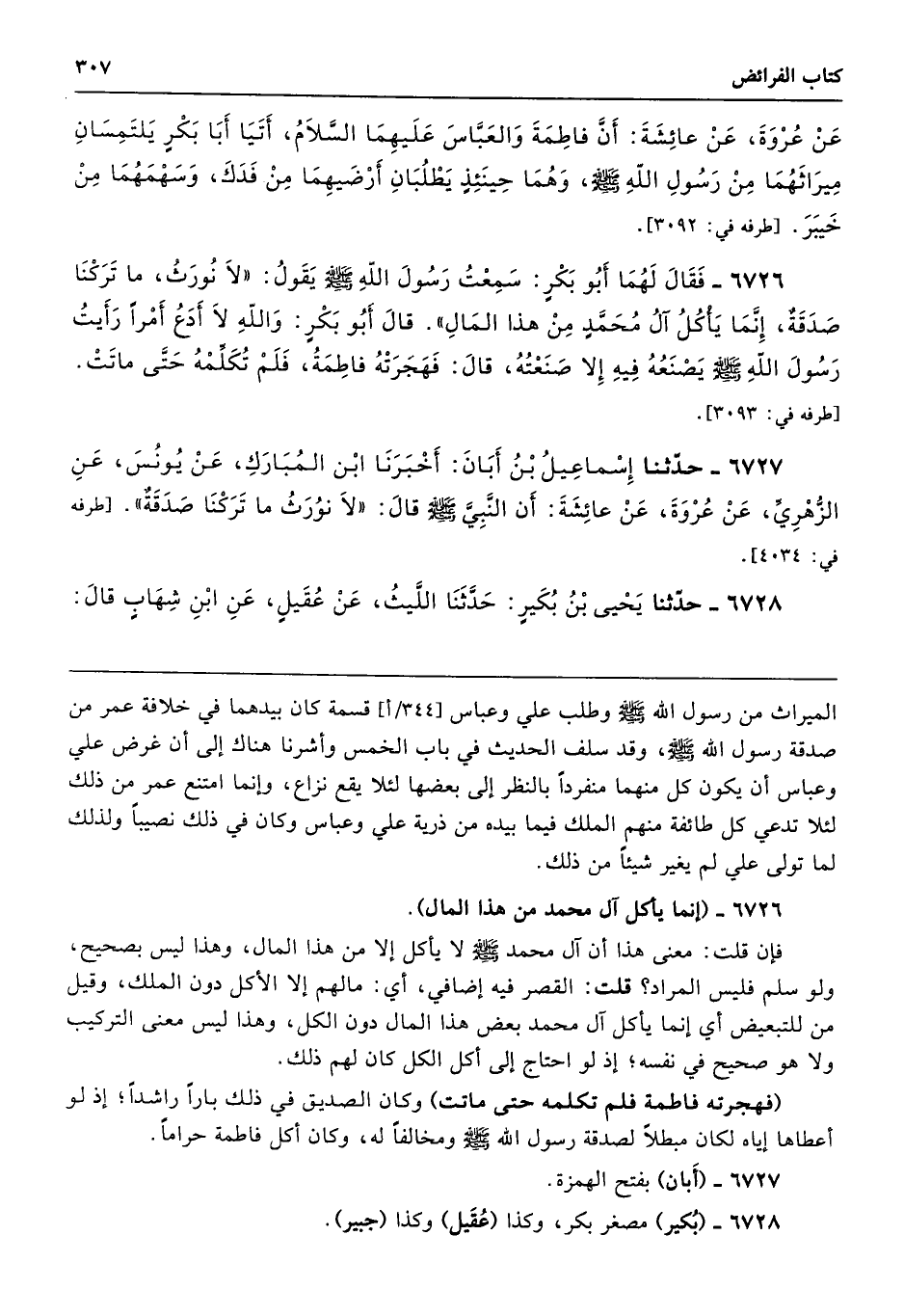 عَنْ عُرْوَةَ عَنْ عَائِشَةَ أَنَّ فَاطِمَةَ وَالْعَبَّاسَ - عَلَيْهِمَا السَّلاَمُ - أَتَيَا أَبَا بَكْرٍ يَلْتَمِسَانِ مِيرَاثَهُمَا مِنْ رَسُولِ اللَّهِ - صلى الله عليه وسلم - وَهُمَا حِينَئِذٍ يَطْلُبَانِ أَرْضَيْهِمَا مِنْ فَدَكَ، وَسَهْمَهُمَا مِنْ خَيْبَرَ. طرفه 3092