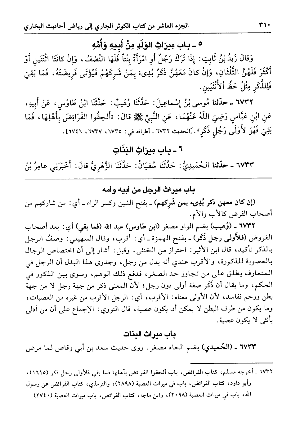 6732 - (وُهيب) بضم الواو مصغر (ابن طاوس) عبد الله (فما بقي) أي: بعد أصحاب الفروض (فلأَولى رجل ذَكَر) -بفتح الهمزة- أي: أقرب، وقال السهيلي: وصفُ الرجل بالذكر تأكيد، قال ابن الأثير: احتراز من الخنثى، وقيل: أشار إلى أن اختصاص الرجال بالعصوبة للذكورة، والأقرب عندي أنه يدل من رجل، وجدوى هذا البدل أن الرجل في المتعارف يطلق على من تجاوز حد الصغر، فدفع ذلك الوهم، وسوى بين الذكور في الحكم، وما يقال أن ذَكَر صفة أولى دون رجل؛ لأن المعنى ذكر من جهة رجل لا من جهة بطن ورحم ففاسد، لأن الأولى معناه: الأقرب، أي: الرجل الأقرب من غيره من العصبات، وما يكون من طرف البطن لا يمكن أن يكون عصبة، قال النووي: الإجماع على أن من أدلى بأنثى لا يكون عصبة.