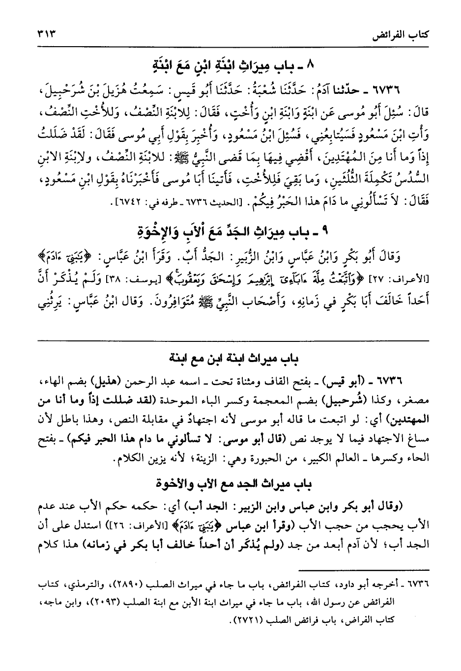 6736 - (أبو قيس) -بفتح القاف ومثناة تحت- اسمه عبد الرحمن (هذيل) بضم الهاء، مصغر، وكذا (شُرحبيل) بضم المعجمة وكسر الباء الموحدة (لقد ضللت إذًا وما أنا من المهتدين) أي: لو اتبعت ما قاله أبو موسى لأنه اجتهادٌ في مقابلة النص، وهذا باطل لأن مساغ الاجتهاد فيما لا يوجد نص (قال أبو موسى: لا تسألوني ما دام هذا الحبر فيكم) -بفتح الحاء وكسرها- العالم الكبير، من الحبورة وهي: الزينة؛ لأنه يزين الكلام.