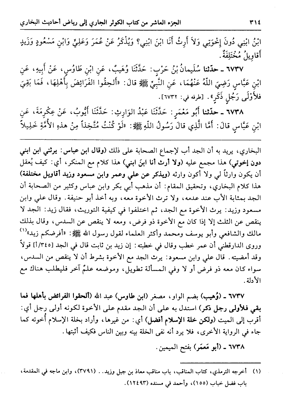 6737 - (وُهيب) بضم الواو، مصغر (ابن طاوس) عبد الله (ألحقوا الفرائض بأهلها فما بقي فلأولى رجل ذكر) استدل به على أن الجد مقدم على الأخوة لكونه أولى رجل أي: أقرب إلى الميت (ولكن خلة الإسلام أفضل) أي: من غيرها، وأراد بخلة الإسلام أُخوته كما جاء في الرواية الأخرى، فلا يرد أنه نفى الخلة بينه وبين الناس فكيف أثبتها.