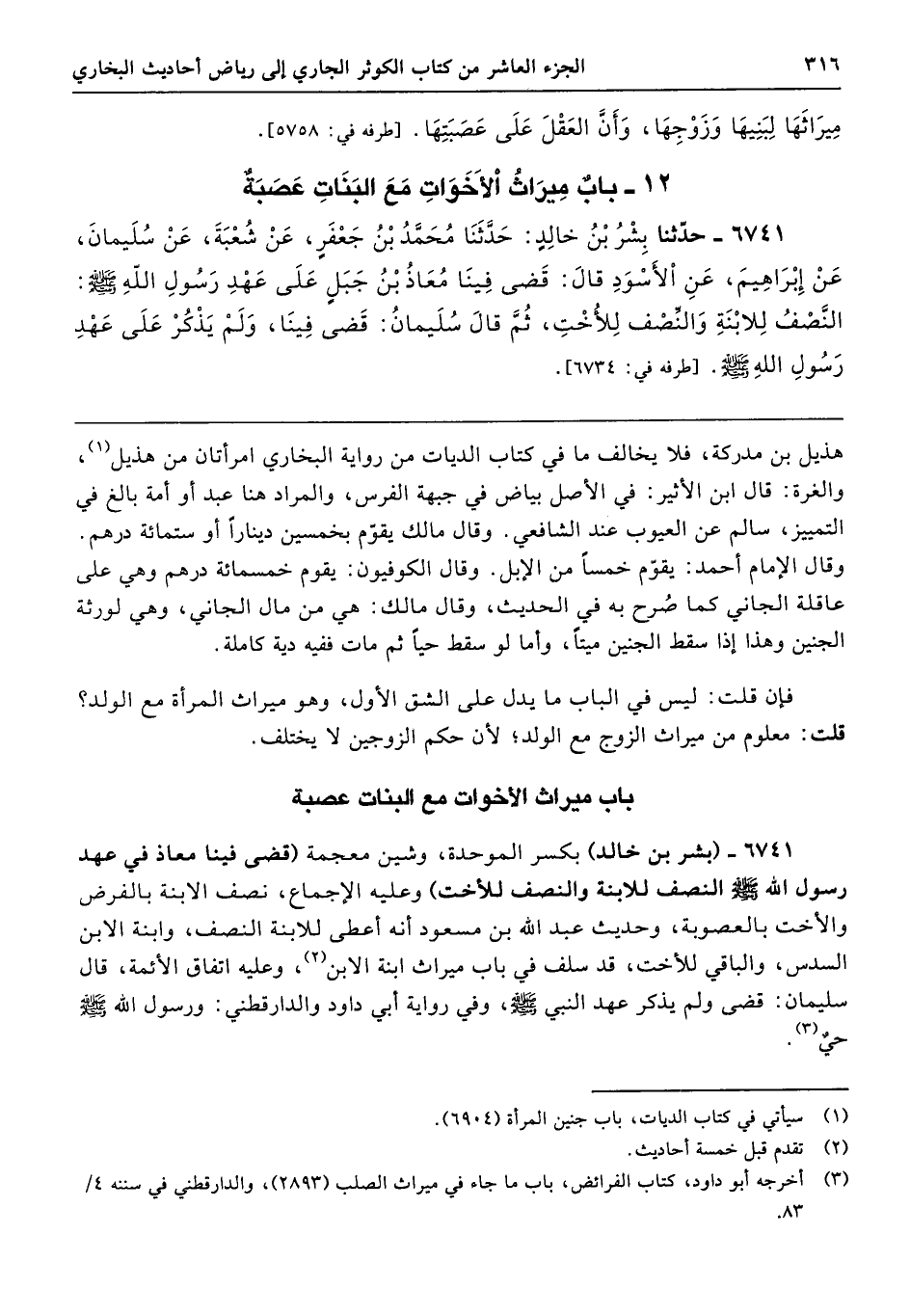 6741 - (بشر بن خالد) بكسر الموحدة، وشين معجمة (قضى فينا معاذ في عهد رسول الله - صلى الله عليه وسلم - النصف للابنة والنصف للاخت) وعليه الإجماع، نصف الابنة بالفرض والأخت بالعصوبة، وحديث عبد الله بن مسعود أنه أعطى للابنة النصف، وابنة الابن السدس، والباقي للأخت، قد سلف في باب ميراث ابنة الابن، وعليه اتفاق الأئمة، قال سليمان: قضى ولم يذكر عهد النبي - صلى الله عليه وسلم -، وفي رواية أبي داود والدارقطني: ورسول الله - صلى الله عليه وسلم - حيٌّ.
