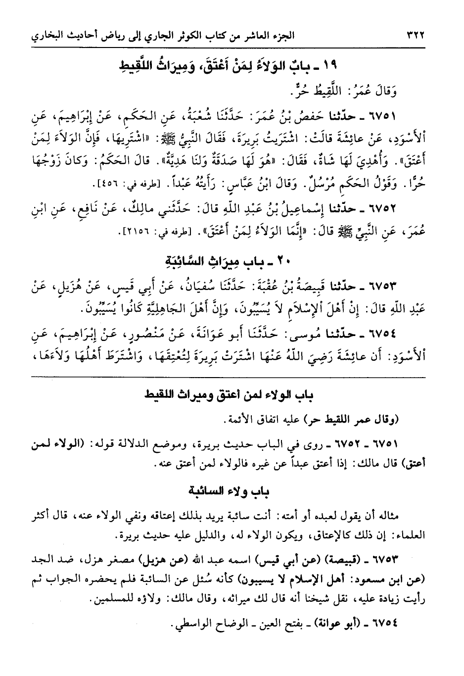 6751 - 6752 - روى في الباب حديث بريرة، وموضع الدلالة قوله: (الولاء لمن أعتق) قال مالك: إذا أعتق عبدًا عن غيره فالولاء لمن أعتق عنه.