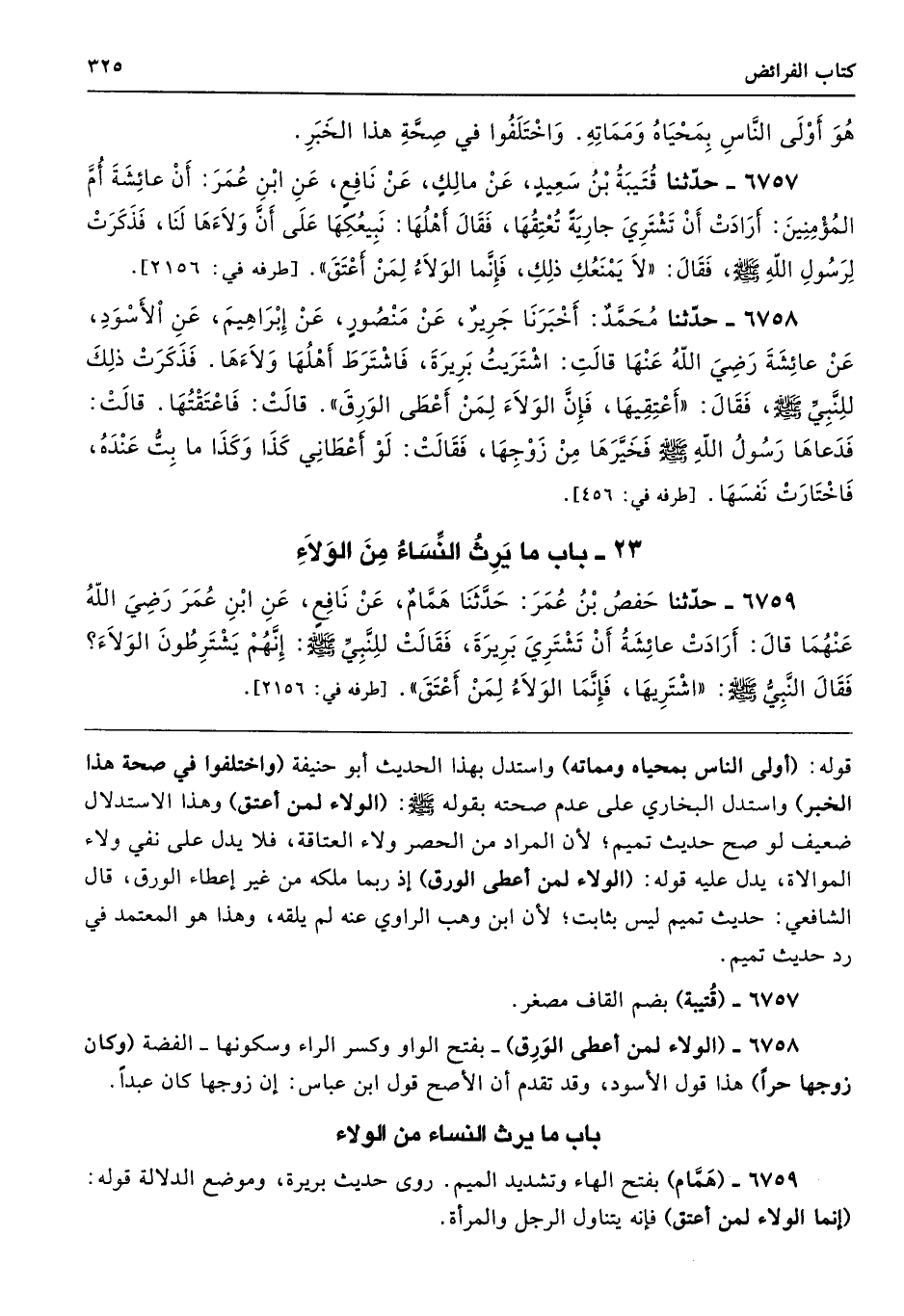 6759 - حَدَّثَنَا حَفْصُ بْنُ عُمَرَ حَدَّثَنَا هَمَّامٌ عَنْ نَافِعٍ عَنِ ابْنِ عُمَرَ - رضى الله عنهما - قَالَ أَرَادَتْ عَائِشَةُ أَنْ تَشْتَرِىَ بَرِيرَةَ فَقَالَتْ لِلنَّبِىِّ - صلى الله عليه وسلم - إِنَّهُمْ يَشْتَرِطُونَ الْوَلاَءَ. فَقَالَ النَّبِىُّ - صلى الله عليه وسلم - «اشْتَرِيهَا، فَإِنَّمَا الْوَلاَءُ لِمَنْ أَعْتَقَ». طرفه 2156