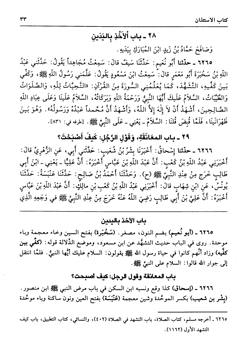 6265 - (أبو نُعيم) بضم النون، مصغر. (سَخْبَرة) بفتح السين وخاء معجمة وباء موحدة. روى في الباب حديث التشهُّد عن ابن مسعود، وموضع الدَّلالة قوله: "كفِّي بين كفَّيه) وزاد أنَّهم كانوا في حياة رسول الله - صلى الله عليه وسلم - يقولون: السلام عليك أيُّها النبيُّ. فلمَّا انتقل إلى جوار الله قالوا: السلام على النبيِّ - صلى الله عليه وسلم -.