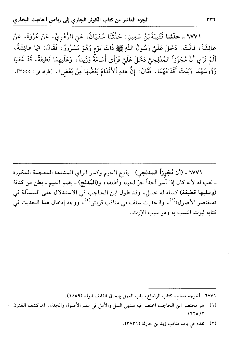 6771 - (أن مُجَزِزًا المدلجي) -بفتح الجيم وكسر الزاي المشددة المعجمة المكررة- لقب له لأنه كان إذا أسر أحدًا جز لحيته وأطلقه، و (المُدلج) -بضم الميم- بطن من كنانة (وعليها قطيفة) كساء له خمل، وقد طول ابن الحاجب في الاستدلال على المسألة في "مختصر الأصول"، والحديث سلف في مناقب قريش، ووجه إدخال هذا الحديث في كتابه ثبوت النسب به وهو سبب الإرث.