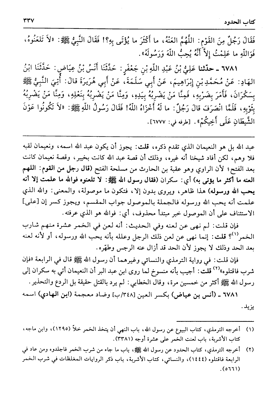 فَقَالَ رَجُلٌ مِنَ الْقَوْمِ اللَّهُمَّ الْعَنْهُ مَا أَكْثَرَ مَا يُؤْتَى بِهِ. فَقَالَ النَّبِىُّ - صلى الله عليه وسلم - «لاَ تَلْعَنُوهُ، فَوَاللَّهِ مَا عَلِمْتُ أَنَّهُ يُحِبُّ اللَّهَ وَرَسُولَهُ».