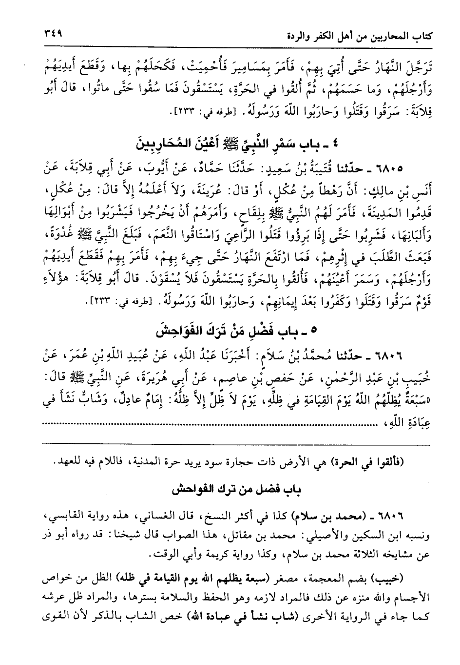 6805 - حَدَّثَنَا قُتَيْبَةُ بْنُ سَعِيدٍ حَدَّثَنَا حَمَّادٌ عَنْ أَيُّوبَ عَنْ أَبِى قِلاَبَةَ عَنْ أَنَسِ بْنِ مَالِكٍ أَنَّ رَهْطًا مِنْ عُكْلٍ - أَوْ قَالَ عُرَيْنَةَ وَلاَ أَعْلَمُهُ إِلاَّ قَالَ مِنْ عُكْلٍ - قَدِمُوا الْمَدِينَةَ، فَأَمَرَ لَهُمُ النَّبِىُّ - صلى الله عليه وسلم - بِلِقَاحٍ، وَأَمَرَهُمْ أَنْ يَخْرُجُوا فَيَشْرَبُوا مِنْ أَبْوَالِهَا وَأَلْبَانِهَا، فَشَرِبُوا حَتَّى إِذَا بَرِئُوا قَتَلُوا الرَّاعِىَ وَاسْتَاقُوا النَّعَمَ، فَبَلَغَ النَّبِىَّ - صلى الله عليه وسلم - غُدْوَةً فَبَعَثَ الطَّلَبَ فِي إِثْرِهِمْ، فَمَا ارْتَفَعَ النَّهَارُ حَتَّى جِئَ بِهِمْ، فَأَمَرَ بِهِمْ فَقَطَعَ أَيْدِيَهُمْ وَأَرْجُلَهُمْ وَسَمَرَ أَعْيُنَهُمْ، فَأُلْقُوا بِالْحَرَّةِ يَسْتَسْقُونَ فَلاَ يُسْقَوْنَ. قَالَ أَبُو قِلاَبَةَ هَؤُلاَءِ قَوْمٌ سَرَقُوا، وَقَتَلُوا، وَكَفَرُوا بَعْدَ إِيمَانِهِمْ، وَحَارَبُوا اللَّهَ وَرَسُولَهُ. طرفه 233