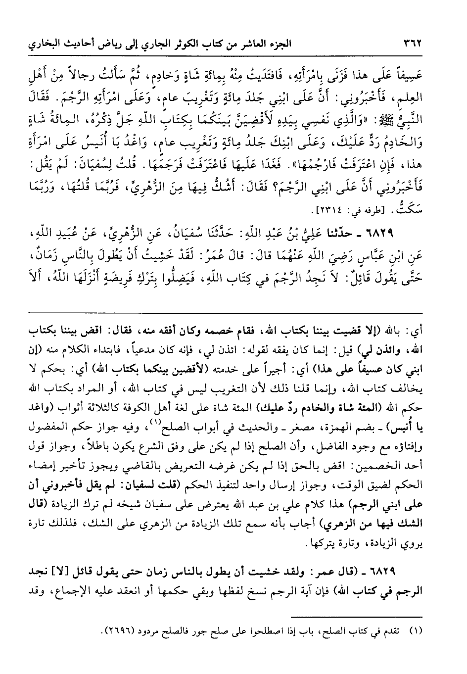 أي: بالله (إلا قضيت بيننا بكتاب الله، فقام خصمه وكان أفقه منه، فقال: اقض بيننا بكتاب الله، وائذن لي) قيل: إنما كان يفقه لقوله: ائذن لي، فإنه كان مدعيًا، فابتداء الكلام منه (أن ابني كان عسيفًا على هذا) أي: أجيرًا على خدمته (لأقضين بينكما بكتاب الله) أي: بحكم لا يخالف كتاب الله، وإنما قلنا ذلك لأن التغريب ليس في كتاب الله، أو المراد بكتاب الله حكم الله (المئة شاة والخادم ردٌّ عليك) المئة شاة على لغة أهل الكوفة كالثلاثة أثواب (واغد يا أُنيس) -بضم الهمزة، مصغر- والحديث في أبواب الصلح، وفيه جواز حكم المفضول وإفتاؤه مع وجود الفاضل، وأن الصلح إذا لم يكن على وفق الشرع يكون باطلًا، وجواز قول أحد الخصمين: اقض بالحق إذا لم يكن غرضه التعريض بالقاضي ويجوز تأخير إمضاء الحكم لضيق الوقت، وجواز إرسال واحد لتنفيذ الحكم (قلت لسفيان: لم يقل فأخبروني أن على ابني الرجم) هذا كلام علي بن عبد الله يعترض على سفيان شيخه لم ترك الزيادة (قال الشك فيها من الزهري) أجاب بأنه سمع تلك الزيادة من الزهري على الشك، فلذلك تارة يروي الزيادة، وتارة يتركها.