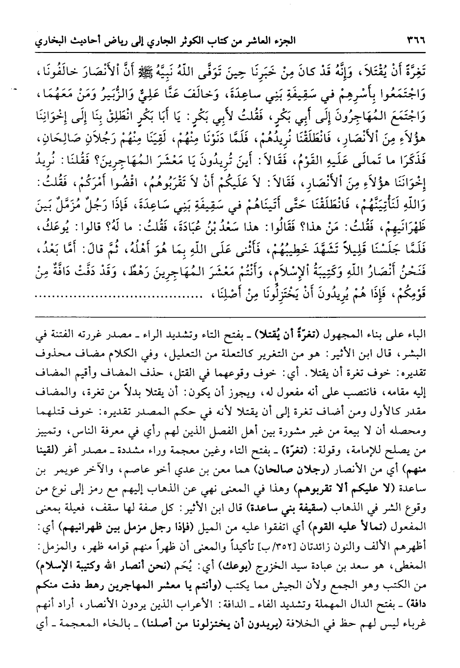 الباء على بناء المجهول (تغرّةً أن يُقتلا) -بفتح التاء وتشديد الراء- مصدر غررته الفتنة في البشر، قال ابن الأثير: هو من التغرير كالتعلة من التعليل، وفي الكلام مضاف محذوف تقديره: خوف تغرة أن يقتلا. أي: خوف وقوعهما في القتل، حذف المضاف وأقيم المضاف إليه مقامه، فانتصب على أنَّه مفعول له، ويجوز أن يكون: أن يقتلا بدلًا من تغرة، والمضاف مقدر كالأول ومن أضاف تغرة إلى أن يقتلا لأنه في حكم المصدر تقديره: خوف قتلهما ومحصله أن لا بيعة من غير مشورة بين أهل الفصل الذين لهم رأي في معرفة الناس، وتمييز من يصلح للإمامة، وقولة: (تغزة) -بفتح التاء وغين معجمة وراء مشددة- مصدر أغر (لقينا منهم) أي من الأنصار (رجلان صالحان) هما معن بن عدي أخو عاصم، والآخر عويمر بن ساعدة (لا عليكم ألا تقربوهم) وهذا في المعنى نهي عن الذهاب إليهم مع رمز إلى نوع من وقوع الشر في الذهاب (سقيفة بني ساعدة) قال ابن الأثير: كل صفة لها سقف، فعيلة بمعنى المفعول (تمالأ عليه القوم) أي اتفقوا عليه من الميل (فإذا رجل مزمل بين ظهرانيهم) أي: أظهرهم الألف والنون زائدتان تأكيدًا والمعنى أن ظهرًا منهم قوامه ظهر، والمزمل: المغطى، هو سعد بن عبادة سيد الخزرج (يوعك) أي: يُحَم (نحن أنصار الله وكتيبة الإسلام) من الكتب وهو الجمع ولأن الجيش مما يكتب (وأنتم يا معشر المهاجرين رهط دفت منكم دافة) -بفتح الدال المهملة وتشديد الفاء- الدافة: الأعراب الذين يردون الأنصار، أراد أنهم غرباء ليس لهم حظ في الخلافة (يريدون أن يختزلونا من أصلنا) -بالخاء المعجمة- أي