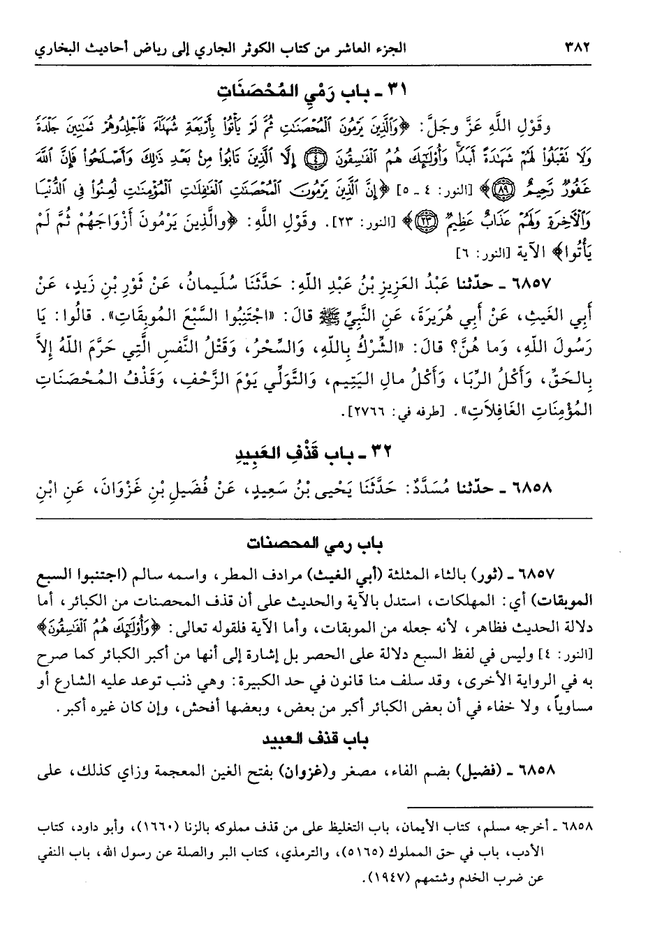 6857 - (ثور) بالثاء المثلثة (أبي الغيث) مرادف المطر، واسمه سالم (اجتنبوا السبع الموبقات) أي: المهلكات، استدل بالآية والحديث على أن قذف المحصنات من الكبائر، أما دلالة الحديث فظاهر، لأنه جعله من الموبقات، وأما الآية فلقوله تعالى: {وَأُوْلَئِكَ هُمُ الْفَاسِقُونَ} [النور: 4] وليس في لفظ السبع دلالة على الحصر بل إشارة إلى أنها من أكبر الكبائر كما صرح به في الرواية الأخرى، وقد سلف منا قانون في حد الكبيرة: وهي ذنب توعد عليه الشارع أو مساويًا، ولا خفاء في أن بعض الكبائر أكبر من بعض، وبعضها أفحش، وإن كان غيره أكبر.