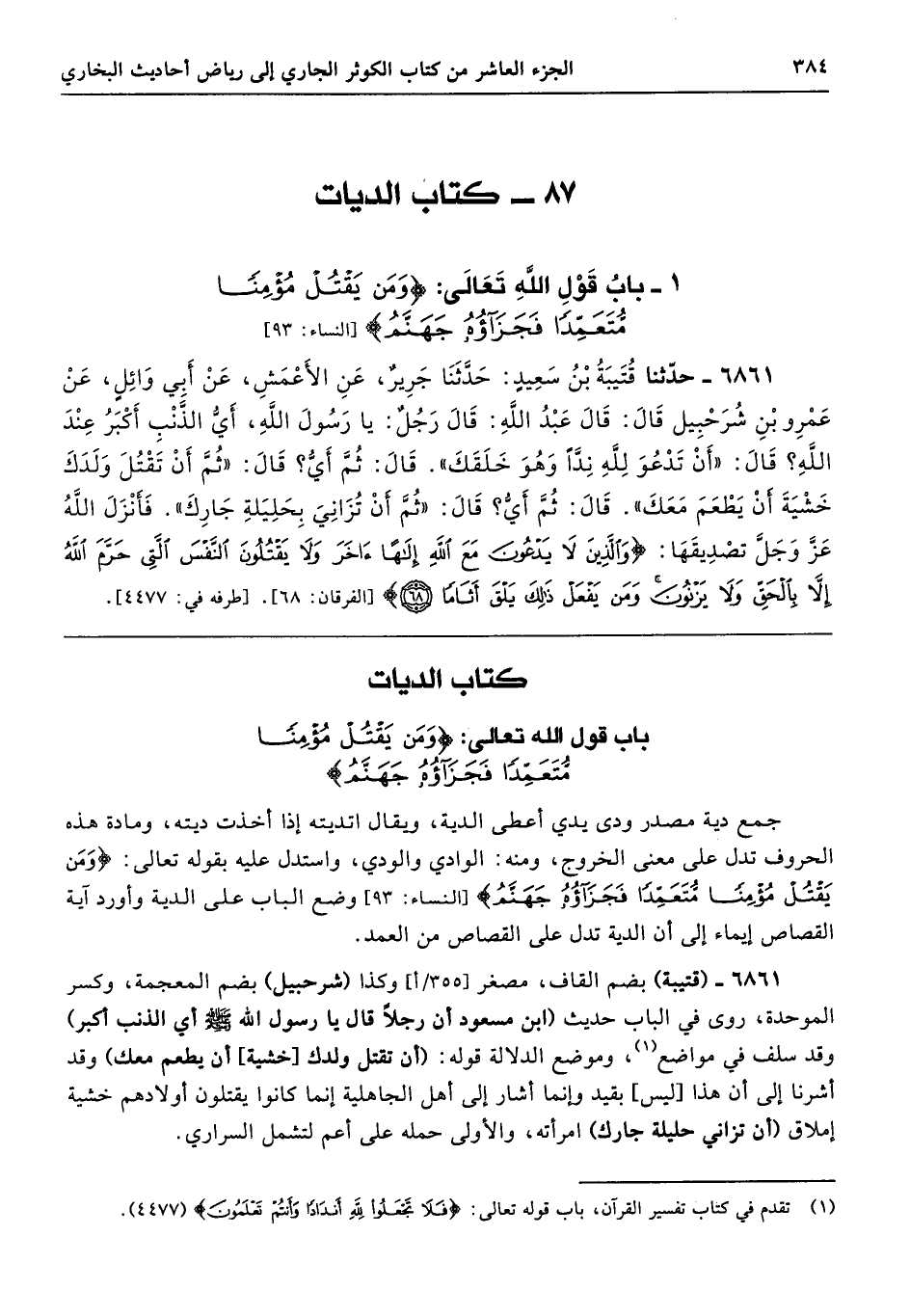 1 - باب قَوْلِ اللَّهِ تَعَالَى (وَمَنْ يَقْتُلْ مُؤْمِنًا مُتَعَمِّدًا فَجَزَاؤُهُ جَهَنَّمُ)