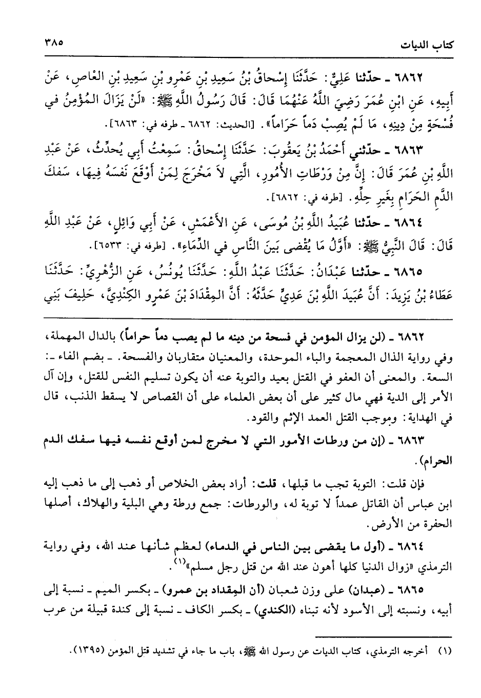 6862 - (لن يزال المؤمن في فسحة من دينه ما لم يصب دمًا حرامًا) بالدال المهملة، وفي رواية الذال المعجمة والباء الموحدة، والمعنيان متقاربان والفسحة. -بضم الفاء-: السعة. والمعنى أن العفو في القتل بعيد والتوبة عنه أن يكون تسليم النفس للقتل، وإن آل الأمر إلى الدية فهي مال كثير على أن بعض العلماء على أن القصاص لا يسقط الذنب، قال في الهداية: وموجب القتل العمد الإثم والقود.