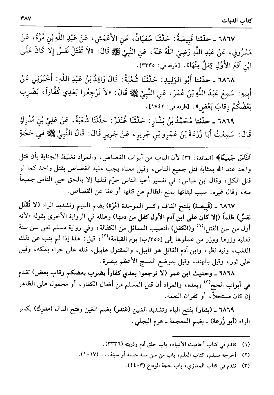 6868 - وحديث ابن عمر (لا ترجعوا بعدي كفارًا يضرب بعضكم رقاب بعض) تقدم في أبواب الحج وبعده، والمراد أن قتل المسلم من أفعال الكفار، أو محمول على الظاهر إن كان مستحلًا، أو كفران النعمة.