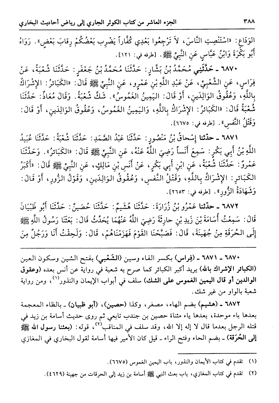6870 - 6871 - (فِراس) بكسر الفاء وسين (الشَعْبي) بفتح الشين وسكون العين (الكبائر الإشراك بالله) يريد أكبر الكبائر كما صرح به شعبة في رواية عن أنس بعده (وعقوق الوالدين أو قال اليمين الغموس على الشك) سلف في أبواب الإيمان والنذور، ومن رواية شعبة بالواو من غير شك.