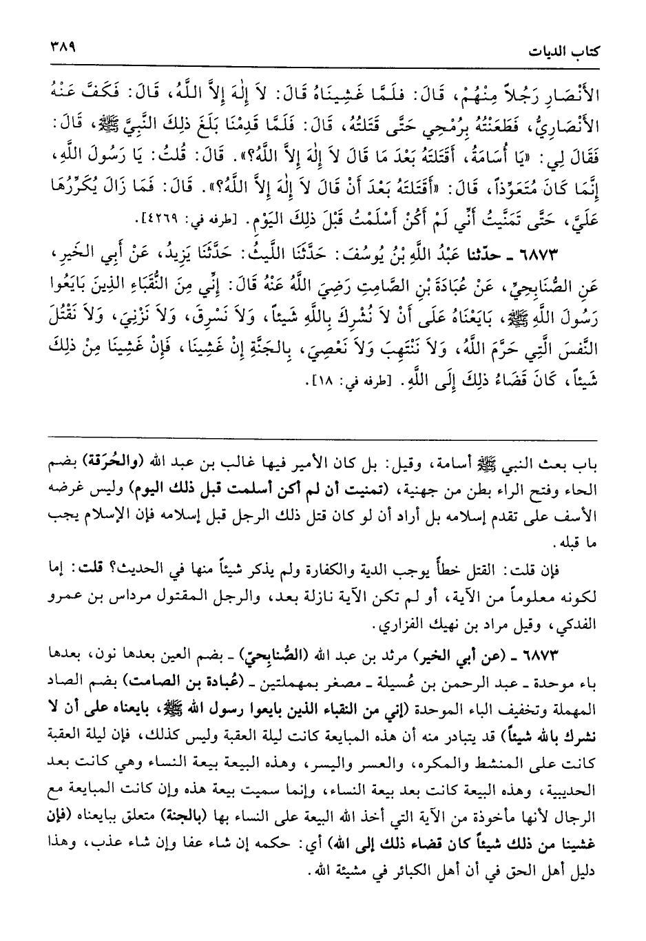 6873 - حَدَّثَنَا عَبْدُ اللَّهِ بْنُ يُوسُفَ حَدَّثَنَا اللَّيْثُ حَدَّثَنَا يَزِيدُ عَنْ أَبِى الْخَيْرِ عَنِ الصُّنَابِحِىِّ عَنْ عُبَادَةَ بْنِ الصَّامِتِ - رضى الله عنه - قَالَ إِنِّى مِنَ النُّقَبَاءِ الَّذِينَ بَايَعُوا رَسُولَ اللَّهِ - صلى الله عليه وسلم - بَايَعْنَاهُ عَلَى أَنْ لاَ نُشْرِكَ بِاللَّهِ شَيْئًا، وَلاَ نَسْرِقَ وَلاَ نَزْنِىَ، وَلاَ نَقْتُلَ النَّفْسَ الَّتِى حَرَّمَ اللَّهُ، وَلاَ نَنْتَهِبَ، وَلاَ نَعْصِىَ، بِالْجَنَّةِ إِنْ فَعَلْنَا ذَلِكَ، فَإِنْ غَشِينَا مِنْ ذَلِكَ شَيْئًا كَانَ قَضَاءُ ذَلِكَ إِلَى اللَّهِ. طرفه 18