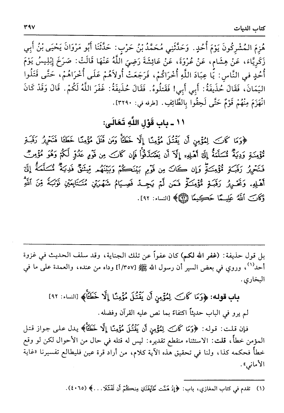 باب قوله: {وَمَا كَانَ لِمُؤْمِنٍ أَنْ يَقْتُلَ مُؤْمِنًا إِلَّا خَطَأً} [النساء: 92]