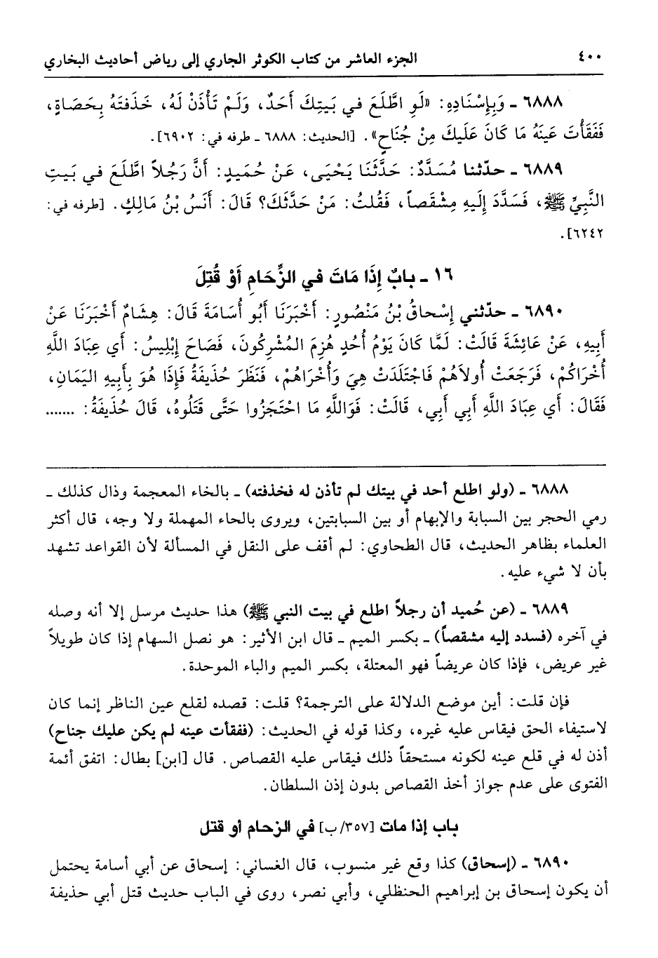6889 - (عن حُميد أن رجلًا اطلع في بيت النبي - صلى الله عليه وسلم -) هذا حديث مرسل إلا أنَّه وصله في آخره (فسدد إليه مشقصًا) -بكسر الميم- قال ابن الأثير: هو نصل السهام إذا كان طويلًا غير عريض، فإذا كان عريضًا فهو المعتلة، بكسر الميم والباء الموحدة.