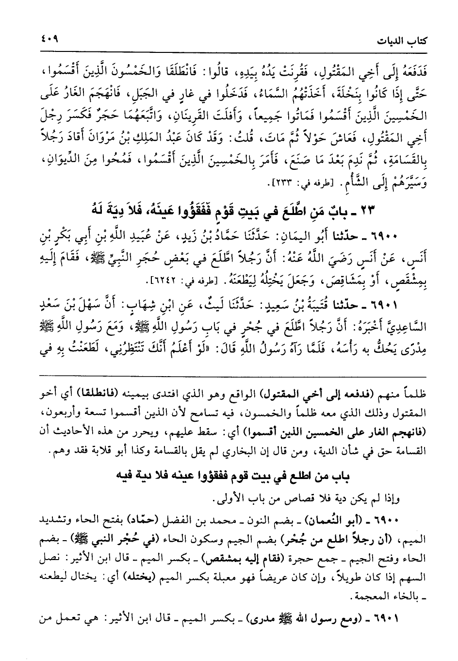 6900 - (أبو النُعمان) -بضم النون- محمد بن الفضل (حمّاد) بفتح الحاء وتشديد الميم، (أن رجلًا اطلع من جُحْر) بضم الجيم وسكون الحاء (في حُجْر النبي - صلى الله عليه وسلم -) -بضم الحاء وفتح الجيم- جمع حجرة (فقام إليه بمشقص) -بكسر الميم- قال ابن الأثير: نصل السهم إذا كان طويلًا، وإن كان عريضًا فهو معبلة بكسر الميم (يختله) أي: يختال ليطعنه -بالخاء المعجمة.