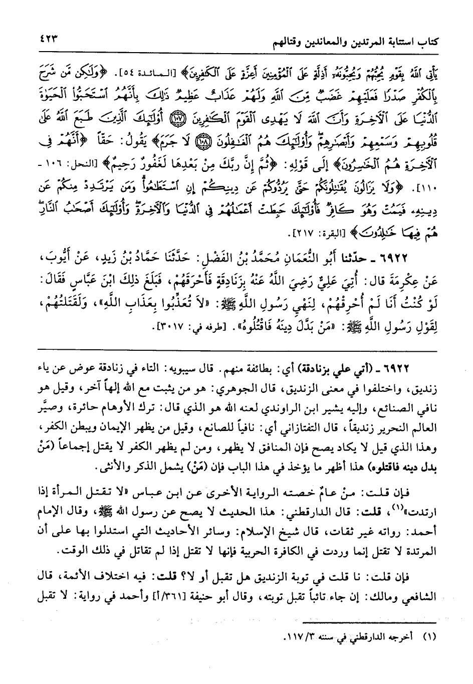 6922 - حَدَّثَنَا أَبُو النُّعْمَانِ مُحَمَّدُ بْنُ الْفَضْلِ حَدَّثَنَا حَمَّادُ بْنُ زَيْدٍ عَنْ أَيُّوبَ عَنْ عِكْرِمَةَ قَالَ أُتِىَ عَلِىٌّ - رضى الله عنه - بِزَنَادِقَةٍ فَأَحْرَقَهُمْ فَبَلَغَ ذَلِكَ ابْنَ عَبَّاسٍ فَقَالَ لَوْ كُنْتُ أَنَا لَمْ أُحْرِقْهُمْ لِنَهْىِ رَسُولِ اللَّهِ - صلى الله عليه وسلم - وَلَقَتَلْتُهُمْ لِقَوْلِ رَسُولِ اللَّهِ - صلى الله عليه وسلم - «مَنْ بَدَّلَ دِينَهُ فَاقْتُلُوهُ». طرفه 3017