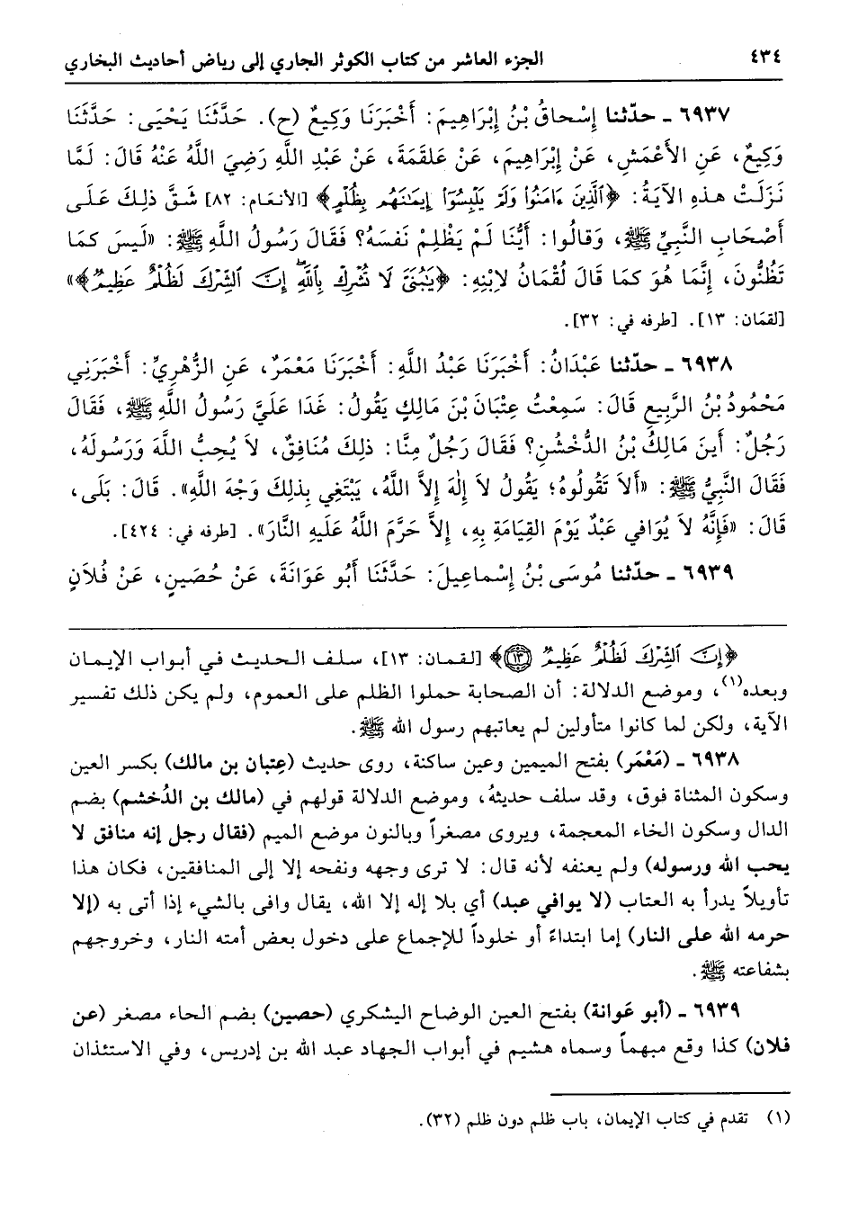 {إِنَّ الشِّرْكَ لَظُلْمٌ عَظِيمٌ (13)} [لقمان: 13]، سلف الحديث في أبواب الإيمان وبعده، وموضع الدلالة: أن الصحابة حملوا الظلم على العموم، ولم يكن ذلك تفسير الآية، ولكن لما كانوا متأولين لم يعاتبهم رسول الله - صلى الله عليه وسلم -.
