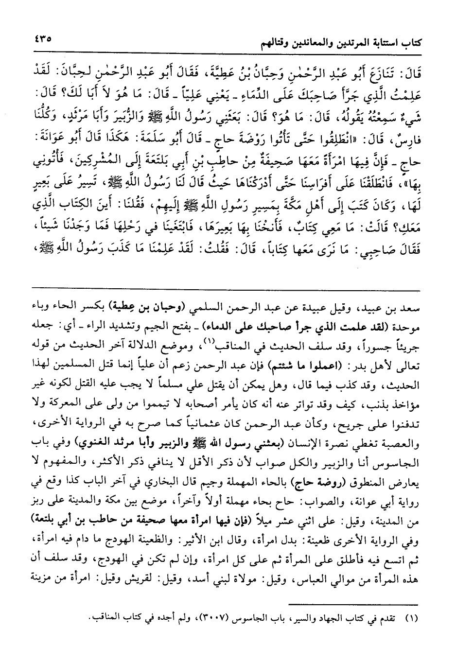قَالَ تَنَازَعَ أَبُو عَبْدِ الرَّحْمَنِ وَحِبَّانُ بْنُ عَطِيَّةَ فَقَالَ أَبُو عَبْدِ الرَّحْمَنِ لِحِبَّانَ لَقَدْ عَلِمْتُ الَّذِى جَرَّأَ صَاحِبَكَ عَلَى الدِّمَاءِ يَعْنِى عَلِيًّا. قَالَ مَا هُوَ لاَ أَبَا لَكَ قَالَ شَىْءٌ سَمِعْتُهُ يَقُولُهُ. قَالَ مَا هُوَ قَالَ بَعَثَنِى رَسُولُ اللَّهِ - صلى الله عليه وسلم - وَالزُّبَيْرَ وَأَبَا مَرْثَدٍ وَكُلُّنَا فَارِسٌ قَالَ «انْطَلِقُوا حَتَّى تَأْتُوا رَوْضَةَ حَاجٍ - قَالَ أَبُو سَلَمَةَ هَكَذَا قَالَ أَبُو عَوَانَةَ حَاجٍ - فَإِنَّ فِيهَا امْرَأَةً مَعَهَا صَحِيفَةٌ مِنْ حَاطِبِ بْنِ أَبِى بَلْتَعَةَ إِلَى الْمُشْرِكِينَ فَأْتُونِى بِهَا». فَانْطَلَقْنَا عَلَى أَفْرَاسِنَا حَتَّى أَدْرَكْنَاهَا حَيْثُ قَالَ لَنَا رَسُولُ اللَّهِ - صلى الله عليه وسلم - تَسِيرُ عَلَى بَعِيرٍ لَهَا، وَكَانَ كَتَبَ إِلَى أَهْلِ مَكَّةَ بِمَسِيرِ رَسُولِ اللَّهِ - صلى الله عليه وسلم - إِلَيْهِمْ. فَقُلْنَا أَيْنَ الْكِتَابُ الَّذِى مَعَكِ قَالَتْ مَا مَعِى كِتَابٌ. فَأَنَخْنَا بِهَا بَعِيرَهَا، فَابْتَغَيْنَا فِي رَحْلِهَا فَمَا وَجَدْنَا شَيْئًا. فَقَالَ صَاحِبِى مَا نَرَى مَعَهَا كِتَابًا. قَالَ فَقُلْتُ لَقَدْ عَلِمْنَا مَا كَذَبَ رَسُولُ اللَّهِ - صلى الله عليه وسلم -