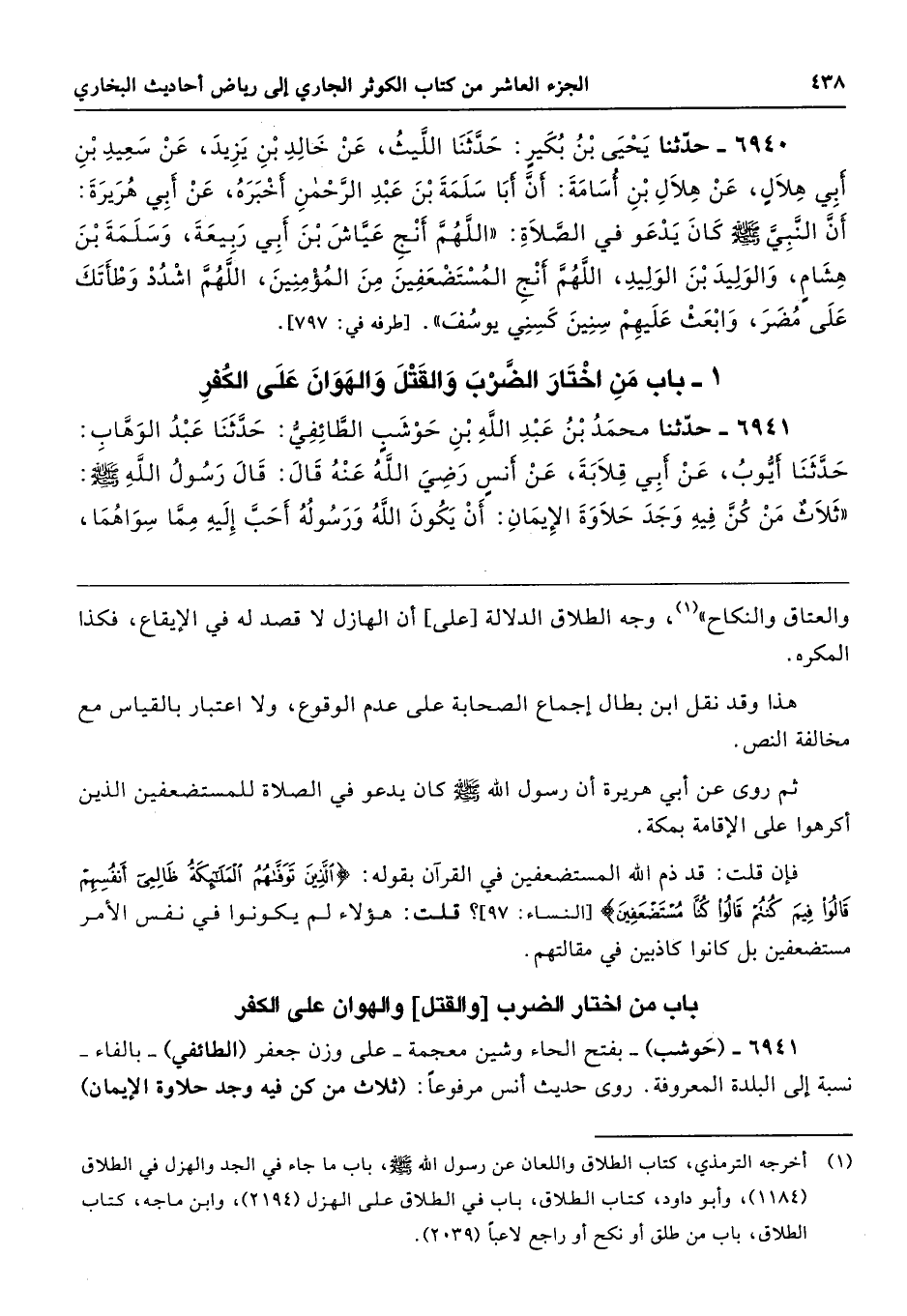 6941 - حَدَّثَنَا مُحَمَّدُ بْنُ عَبْدِ اللَّهِ بْنِ حَوْشَبٍ الطَّائِفِىُّ حَدَّثَنَا عَبْدُ الْوَهَّابِ حَدَّثَنَا أَيُّوبُ عَنْ أَبِى قِلاَبَةَ عَنْ أَنَسٍ - رضى الله عنه - قَالَ قَالَ رَسُولُ اللَّهِ - صلى الله عليه وسلم - «ثَلاَثٌ مَنْ كُنَّ فِيهِ وَجَدَ حَلاَوَةَ الإِيمَانِ أَنْ يَكُونَ اللَّهُ وَرَسُولُهُ أَحَبَّ إِلَيْهِ مِمَّا سِوَاهُمَا،