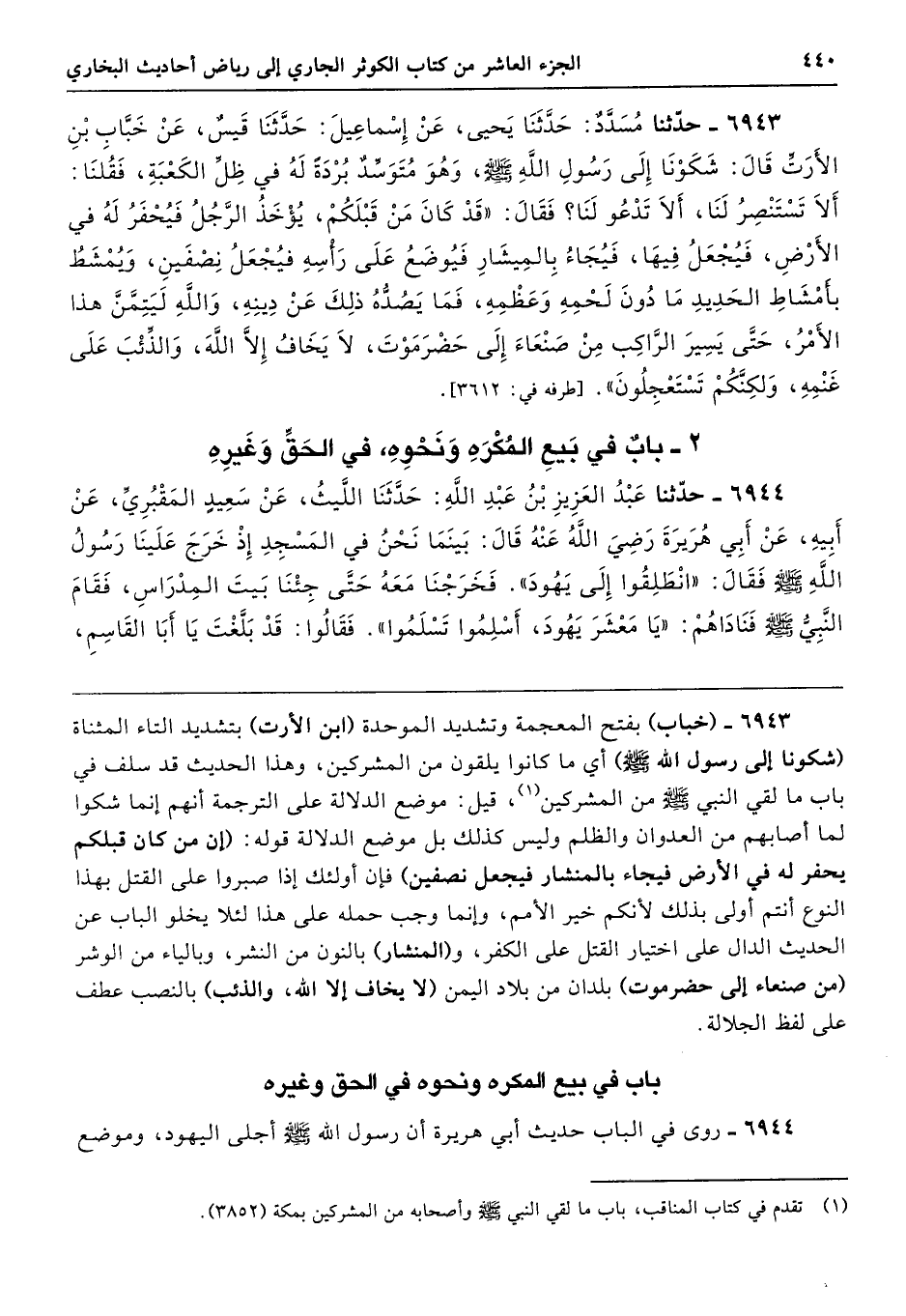6943 - (خباب) بفتح المعجمة وتشديد الموحدة (ابن الأرت) بتشديد التاء المثناة (شكونا إلى رسول الله - صلى الله عليه وسلم -) أي ما كانوا يلقون من المشركين، وهذا الحديث قد سلف في باب ما لقي النبي - صلى الله عليه وسلم - من المشركين، قيل: موضع الدلالة على الترجمة أنهم إنما شكوا لما أصابهم من العدوان والظلم وليس كذلك بل موضع الدلالة قوله: (إن من كان قبلكم جفر له في الأرض فيجاء بالمنشار فيجعل نصفين) فإن أولئك إذا صبروا على القتل بهذا النوع أنتم أولى بذلك لأنكم خير الأمم، وإنما وجب حمله على هذا لئلا يخلو الباب عن الحديث الدال على اختيار القتل على الكفر، و (المنشار) بالنون من النشر، وبالياء من الوشر (من صنعاء إلى حضرموت) بلدان من بلاد اليمن (لا يخاف إلا الله، والذئب) بالنصب عطف على لفظ الجلالة.