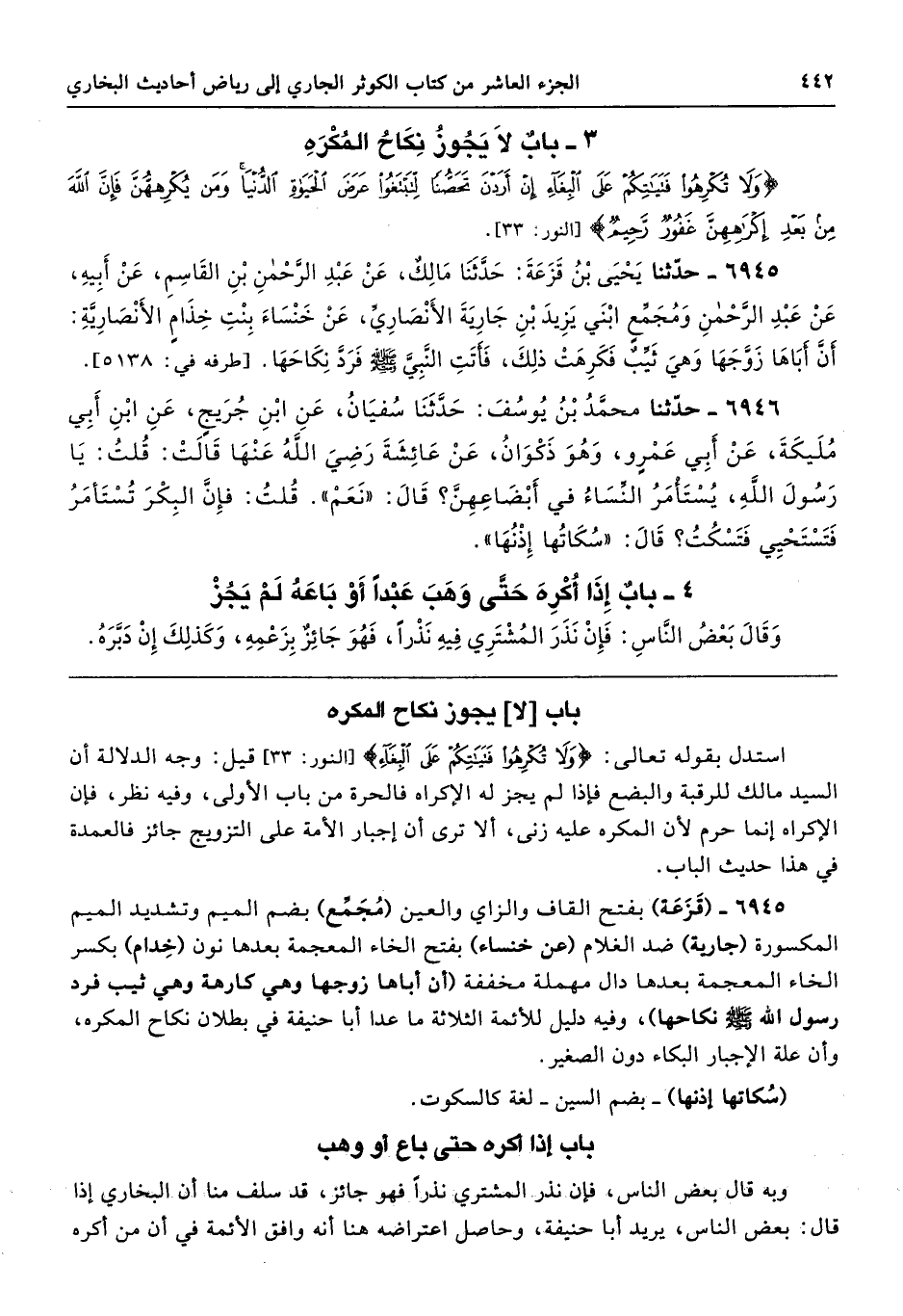6945 - (قَزَعَة) بفتح القاف والزاي والعين (مُجَمِّع) بضم الميم وتشديد الميم المكسورة (جارية) ضد الغلام (عن خنساء) بفتح الخاء المعجمة بعدها نون (خِدام) بكسر الخاء المعجمة بعدها دال مهملة مخففة (أن أباها زوجها وهي كارهة وهي ثيب فرد رسول الله - صلى الله عليه وسلم - نكاحها)، وفيه دليل للأئمة الثلاثة ما عدا أبا حنيفة في بطلان نكاح المكره، وأن علة الإجبار البكاء دون الصغير.