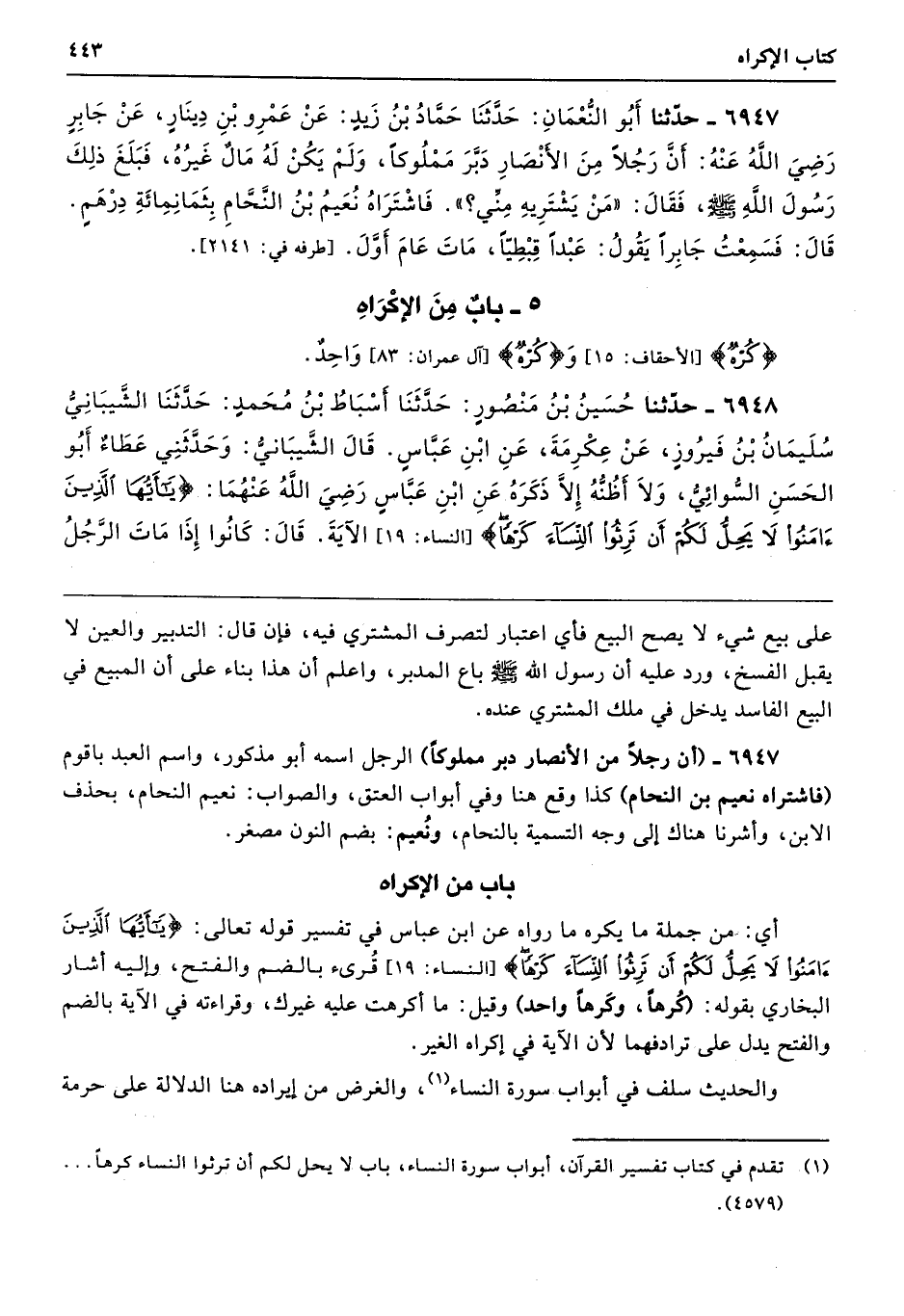 6947 - (أن رجلًا من الأنصار دبر مملوكًا) الرجل اسمه أبو مذكور، واسم العبد باقوم (فاشتراه نعيم بن النحام) كذا وقع هنا وفي أبواب العتق، والصواب: نعيم النحام، بحذف الابن، وأشرنا هناك إلى وجه التسمية بالنحام، ونُعيم: بضم النون مصغر.