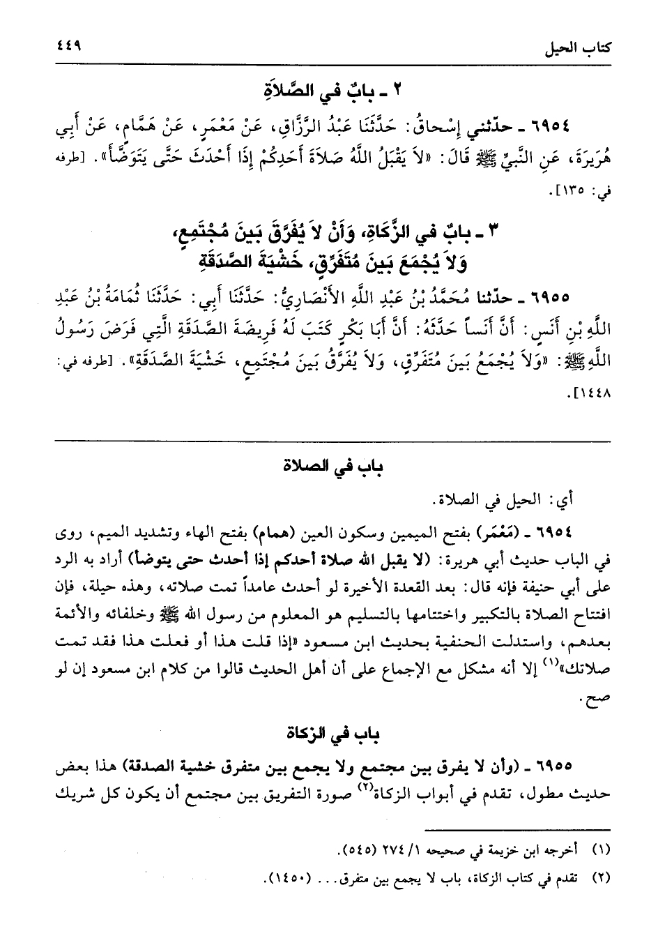 6954 - (معمَر) بفتح الميمين وسكون العين (همام) بفتح الهاء وتشديد الميم، روى في الباب حديث أبي هريرة: (لا يقبل الله صلاة أحدكم إذا أحدث حتى يتوضأ) أراد به الرد على أبي حنيفة فإنه قال: بعد القعدة الأخيرة لو أحدث عامدًا تمت صلاته، وهذه حيلة، فإن افتتاح الصلاة بالتكبير واختتامها بالتسليم هو المعلوم من رسول الله - صلى الله عليه وسلم - وخلفائه والأئمة بعدهم، واستدلت الحنفية بحديث ابن مسعود "إذا قلت هذا أو فعلت هذا فقد تمت صلاتك" إلا أنه مشكل مع الإجماع على أن أهل الحديث قالوا من كلام ابن مسعود إن لو صح.