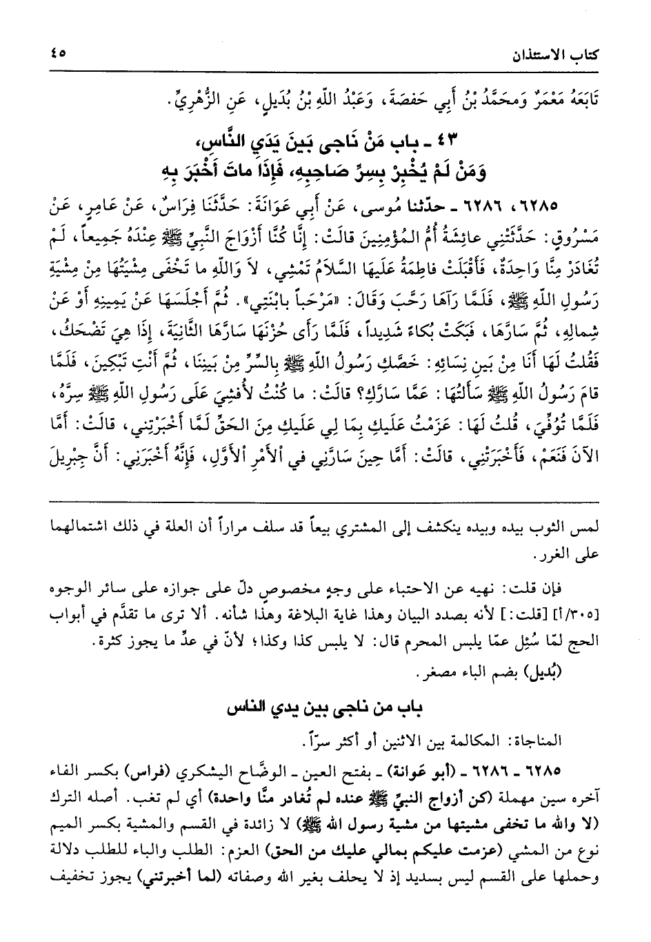 6285 - 6286 - (أبو عَوانة) -بفتح العين- الوضَّاح اليشكري (فراس) بكسر الفاء آخره سين مهملة (كن أزواج النبيِّ - صلى الله عليه وسلم - عنده لم تُغادر منَّا واحدة) أي لم تغب. أصله الترك (لا والله ما تخفى مشيتها من مشية رسول الله - صلى الله عليه وسلم -) لا زائدة في القسم والمشية بكسر الميم نوع من المشي (عزمت عليكم بمالي عليك من الحق) العزم: الطلب والباء للطلب دلالة وحملها على القسم ليس بسديد إذ لا يحلف بغير الله وصفاته (لما أخبرتني) يجوز تخفيف