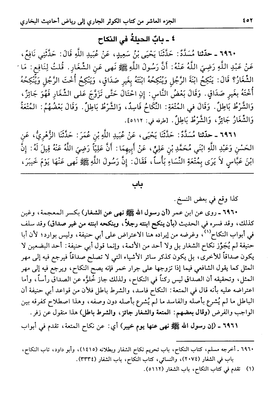 6960 - روى عن ابن عمر (أن رسول الله - صلى الله عليه وسلم - نهى عن الشغار) بكسر المعجمة، وغين كذلك، وقد فسره في الحديث (بأن ينكح ابنته رجلًا، وينكحه ابنته من غير صداق) وقد سلف في أبواب النكاح، وغرضه من إيراده هنا الاعتراض على أبي حنيفة، وليس بوارد؛ لأن أبا حنيفة لم يُجَوِّز نكاح الشغار بل ولا أحد من الأئمة، وإنما قول أبي حنيفة: أحد البضعين لا يكون صداقًا للأخرى، بل يكون كذكر سائر الأشياء التي لا تصلح صداقًا فيرجع فيه إلى مهر المثل كما يقول الشافعي فيما إذا تزوجها على جرار خمر فإنه يصح النكاح، ويرجع فيه إلى مهر المثل، وتحقيقه أن الصداق ليس ركنًا في النكاح، ولذلك جاز خُلوُّه عن الصداق رأسًا، وأما اعتراضه عليه بأنه قال في المتعة: النكاح فاسد، والشرط باطل فلأن من قواعد أبي حنيفة أن الباطل ما لم يُشرع بأصله والفاسد ما لم يُشرع بأصله دون وصفه، وهذا اصطلاح كفرقه بين الواجب والفرض (وقال بعضهم: المتعة والشغار جائز، والشرط باطل) هذا منقول عن زفر.