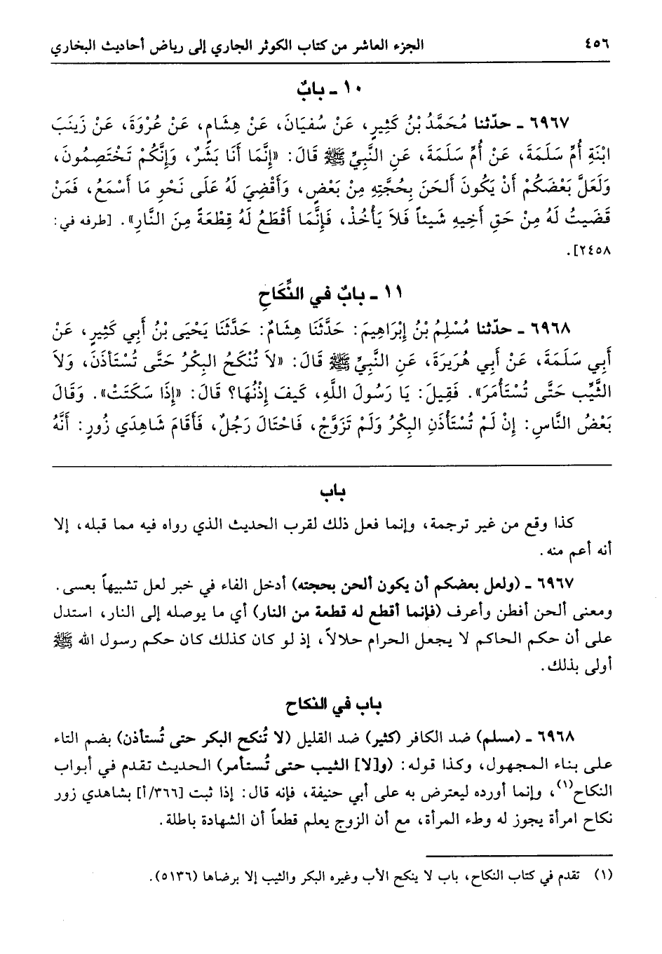 6968 - (مسلم) ضد الكافر (كثير) ضد القليل (لا تُنكح البكر حتى تُستأذن) بضم التاء على بناء المجهول، وكذا قوله: (و [لا] الثيب حتى تُستأمر) الحديث تقدم في أبواب النكاح، وإنما أورده ليعترض به على أبي حنيفة، فإنه قال: إذا ثبت بشاهدي زور نكاح امرأة يجوز له وطء المرأة، مع أن الزوج يعلم قطعًا أن الشهادة باطلة.
