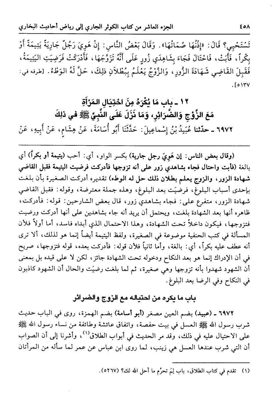 6972 - (عبيد) بضم العين مصغر (أبو أسامة) بضم الهمزة، روى في الباب حديث شرب رسول الله - صلى الله عليه وسلم - العسل في بيت حفصة، واتفاق عائشة وطائفة من نساء رسول الله - صلى الله عليه وسلم - على الاحتيال عليه في ذلك، وقد الحديث في أبواب الطلاق، وأشرنا إلى أن الصواب أن التي شرب عندها العسل هي زينب، لما روى ابن عباس عن عمر لما سأله من المرأتان