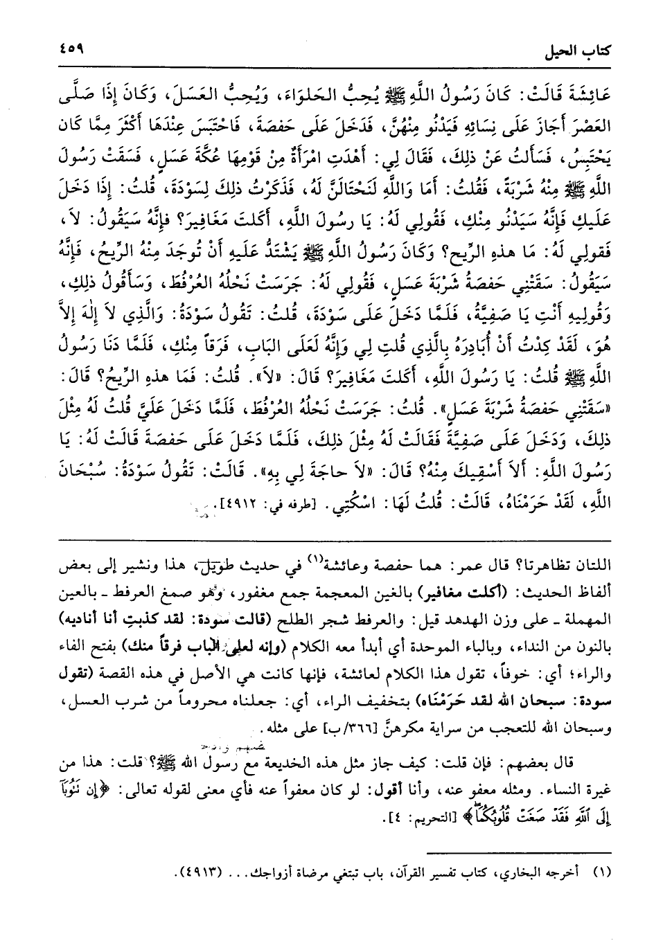 اللتان تظاهرتا؟ قال عمر: هما حفصة وعائشة في حديث طويل، هذا ونشير إلى بعض ألفاظ الحديث: (أكلت مغافير) بالغين المعجمة جمع مغفور، وهو صمغ العرفط -بالعين المهملة- على وزن الهدهد قيل: والعرفط شجر الطلح (قالت سودة: لقد كذبتِ أنا أناديه) بالنون من النداء، وبالباء الموحدة أي أبدًا معه الكلام (وإنه لعلى الباب فرقًا منك) بفتح الفاء والراء؛ أي: خوفًا، تقول هذا الكلام لعائشة، فإنها كانت هي الأصل في هذه القصة (تقول سودة: سبحان الله لقد حَرَمنَاه) بتخفيف الراء، أي: جعلناه محرومًا من شرب العسل، وسبحان الله للتعجب من سراية مكرهنَّ على مثله.