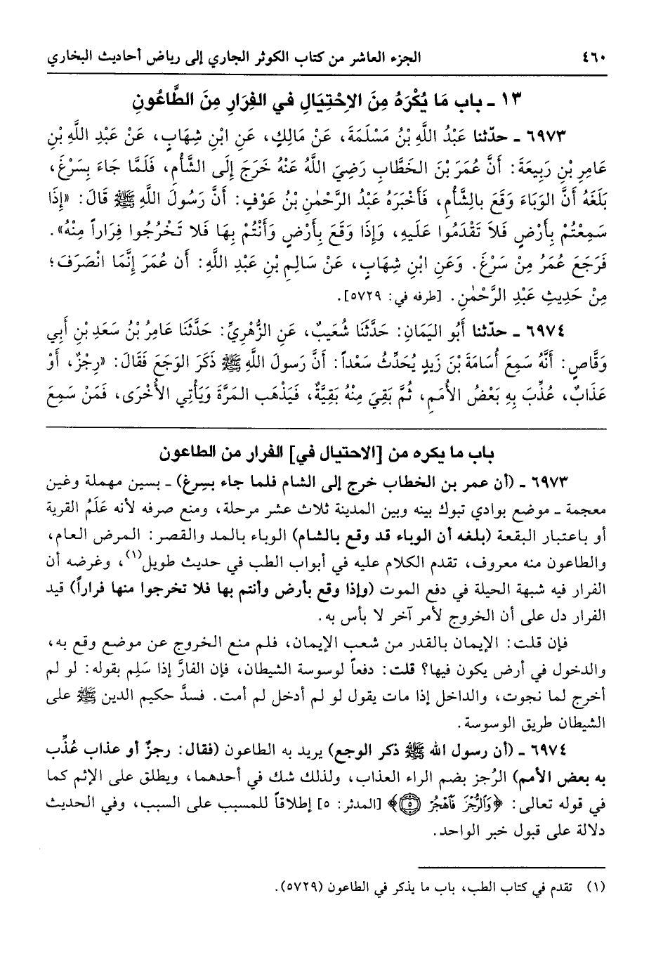 6973 - (أن عمر بن الخطاب خرج إلى الشام فلما جاء بسِرغ) -بسين مهملة وغين معجمة- موضع بوادي تبوك بينه وبين المدينة ثلاث عشر مرحلة، ومنع صرفه لأنه عَلَمُ القرية أو باعتبار البقعة (بلغه أن الوباء قد وقع بالشام) الوباء بالمد والقصر: المرض العام، والطاعون منه معروف، تقدم الكلام عليه في أبواب الطب في حديث طويل، وغرضه أن الفرار فيه شبهة الحيلة في دفع الموت (وإذا وقع بأرض وأنتم بها فلا تخرجوا منها فرارًا) قيد الفرار دل على أن الخروج لأمر آخر لا بأس به.