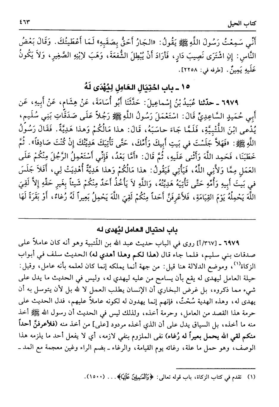 6979 - روى في الباب حديث عبد الله بن اللّتبية وهو أنه كان عاملًا على صدقات بني سليم، فلما جاء قال (هذا لكم وهذا أهدي له) الحديث سلف في أبواب الزكاة، وموضع الدلالة هنا قيل: من جهة أنما يملكه إنما كان لعلمه بأنه عامل، وقيل: حيلة العامل ليهدى له يقع بأن يسامح من عليه ليهدي له، وليس في الحديث ما يدل على شيء مما ذكروه، بل غرض البخاري أن الإنسان يطلب العمل لا لله بل لأن يتوسل به أن يهدى له، وهذه الهدية سُحْتٌ، فإنهم إنما يهدون له لكونه عاملًا عليهم، فدل الحديث على حرمة هذا القصد من العامل، وحرمة أخذه، ولذلك ليس في الحديث أن رسول الله - صلى الله عليه وسلم - أخذ منه ما أخذه، بل السياق يدل على أن الذي أخذه مردود [على] من أخذ منه (فلأعرفنَّ أحدًا منكم لقي الله يحمل بعيرًا له رُغاء) نفى الملزوم بنفي لازمه، أي لا يفعل أحد ما يلزمه هذا الوصف، وهو حمل ما علة، رغائه يوم القيامة، والرغاء -بضم الراء وغين معجمة مع المد-