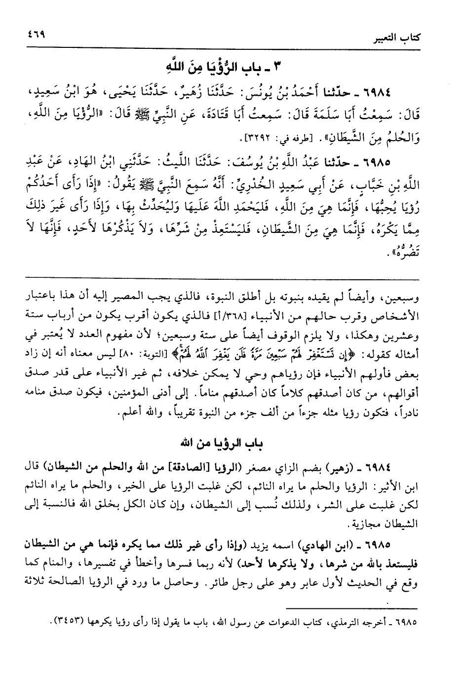 6985 - حَدَّثَنَا عَبْدُ اللَّهِ بْنُ يُوسُفَ حَدَّثَنَا اللَّيْثُ حَدَّثَنِى ابْنُ الْهَادِ عَنْ عَبْدِ اللَّهِ بْنِ خَبَّابٍ عَنْ أَبِى سَعِيدٍ الْخُدْرِىِّ أَنَّهُ سَمِعَ النَّبِىَّ - صلى الله عليه وسلم - يَقُولُ «إِذَا رَأَى أَحَدُكُمْ رُؤْيَا يُحِبُّهَا فَإِنَّمَا هِىَ مِنَ اللَّهِ، فَلْيَحْمَدِ اللَّهَ عَلَيْهَا، وَلْيُحَدِّثْ بِهَا، وَإِذَا رَأَى غَيْرَ ذَلِكَ مِمَّا يَكْرَهُ، فَإِنَّمَا هِىَ مِنَ الشَّيْطَانِ، فَلْيَسْتَعِذْ مِنْ شَرِّهَا، وَلاَ يَذْكُرْهَا لأَحَدٍ، فَإِنَّهَا لاَ تَضُرُّهُ».